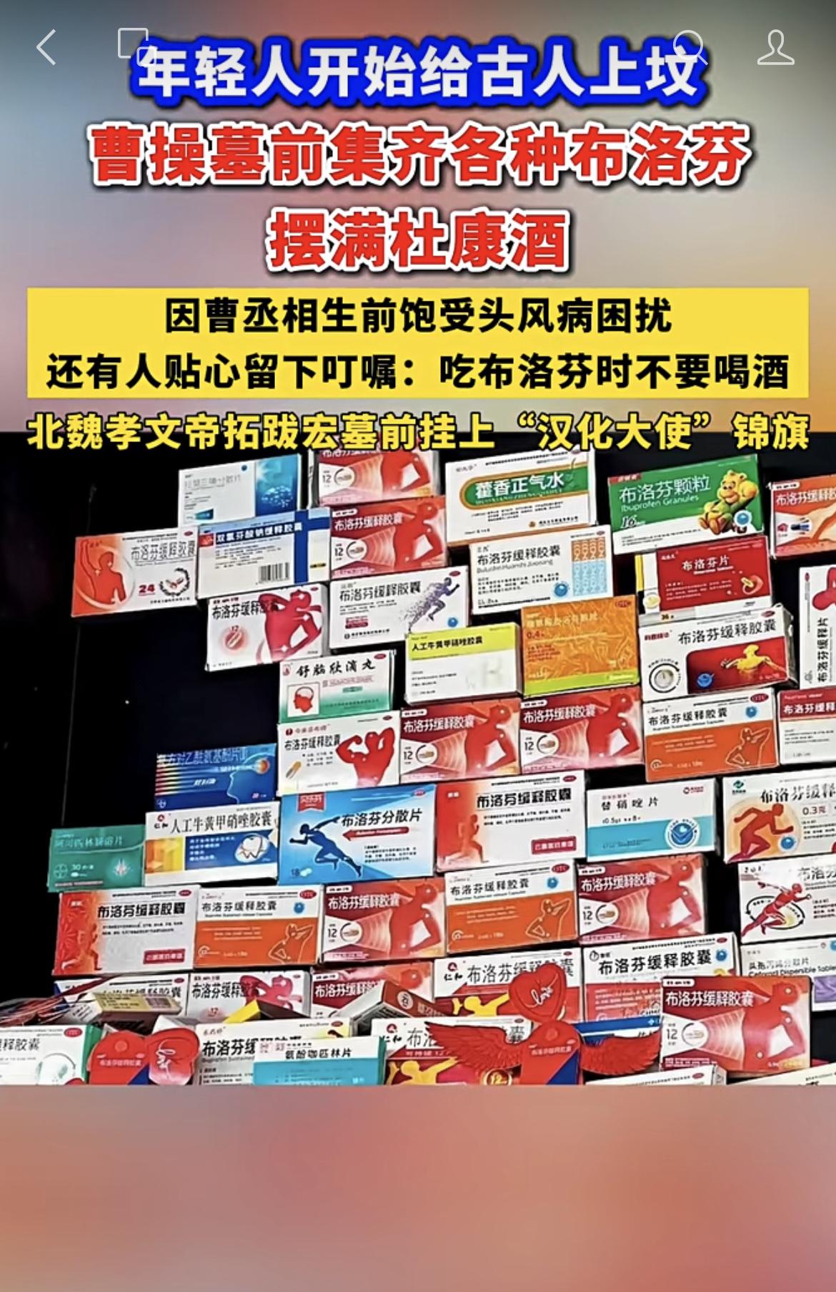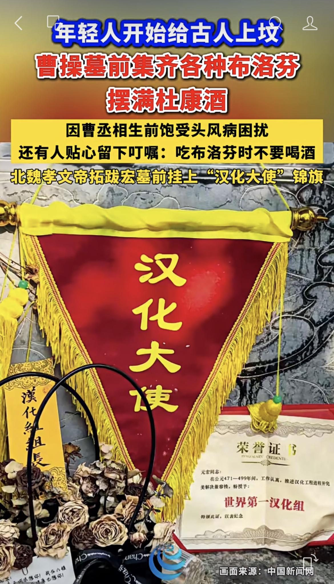 年轻人开始给古人上坟,曹操墓前集齐各种布洛芬,摆满杜康酒。北魏孝文帝墓前挂上“汉