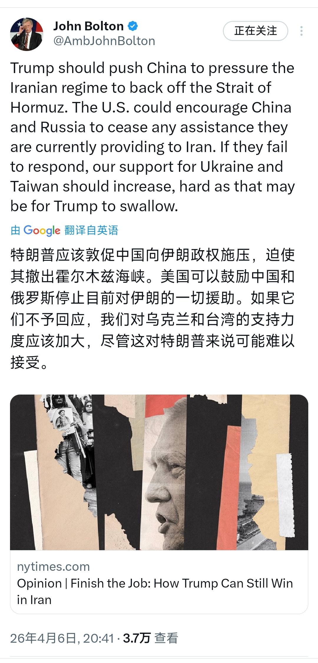 美国前国家安全顾问约翰·博尔顿今晚(北京时间4月6日晚)给特朗普支招:“特朗普应当促使中国向伊朗政权施压,使其从霍尔木兹海峡撤退。美国可以鼓励中国和俄罗斯停止目前对伊朗提供的任何援助。如果他们不作出回应,那么我们对乌克兰和台湾的支持应当增加,尽管这对特朗普来说可能难以接受。” [机智]评几句:最合适的方式是美以停止对伊朗的侵略,但是好战分子博尔顿肯定不会提出。这位惯于煽风点火的鹰派政客,又在为特朗普献上祸乱四方的馊主意,妄图将中国拖入美伊纷争,还拿乌克兰和台湾问题作要挟,其霸权逻辑卑劣又愚蠢。霍尔木兹海峡的局势本是美以非法军事行动挑起,伊朗的反制正当合理,博尔顿却颠倒黑白要求中方施压,全然无视国际关系基本准则。台湾问题是中国内政,乌克兰问题有其自身经纬,岂能成为美国转嫁战争危机的筹码?博尔顿的叫嚣,不过是霸权主义穷途末路的歇斯底里,既低估了中国捍卫核心利益的坚定决心,也暴露了美方能打不能赢、只能靠操弄议题续命的狼狈。