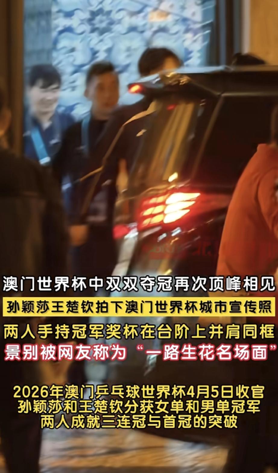 孙颖莎和王楚钦澳门夺冠后,深夜12点左右跑到澳门市政局门口拍摄,真是够辛苦。 4月5日的乒乓球世界杯比赛中,王楚钦和孙颖莎分别获得男单和女单冠军,其中孙颖莎还是三连冠,值得庆贺。 这次比赛是在中国澳门举办的,而澳门是一个旅游城市,想着两位夺冠以后休息一下,第2天要在澳门旅游一番再回家。 没想到两位夺冠后从比赛现场走出来,径直坐车到了市政局门口拍摄,两位是要帮忙做宣传,拍一个手捧奖杯同框的照片。 有网友在澳门旅游的时候,刚好就看到他们了,当时已是夜里12点,只见孙颖莎表情淡定,就好像没夺冠似的,依旧穿着比赛时的服装,和队友站在一起。 原来冠军没有想象中那么轻松,夺冠以后还要拍摄,真是挺辛苦的。