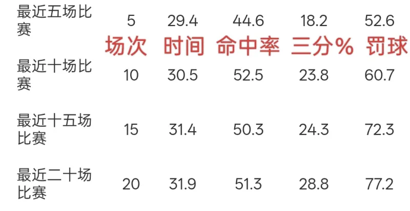 巴恩斯过去5场,10场,15场,20场场均数据一览