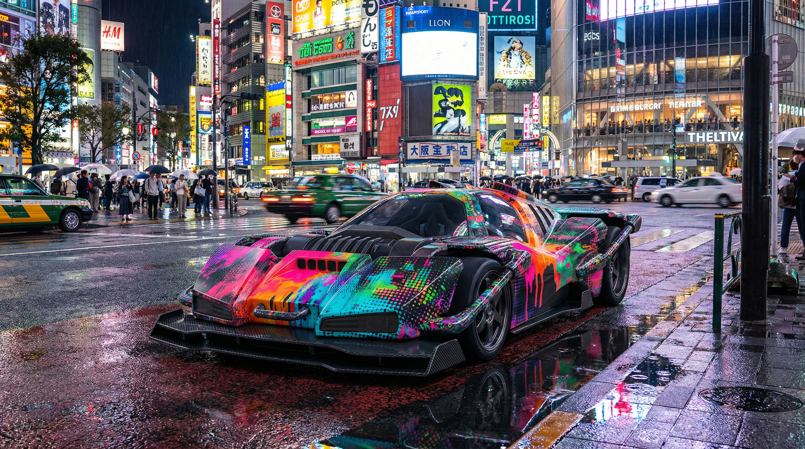 其次,像不像真车,这里的提示词高度讲究一个【指向性】,比如炫酷战斗风改装的跑车,很抽象,LB套件改装的日产GT-R R32跑车很具体,这张图画的四驱兄弟巨无霸同理。