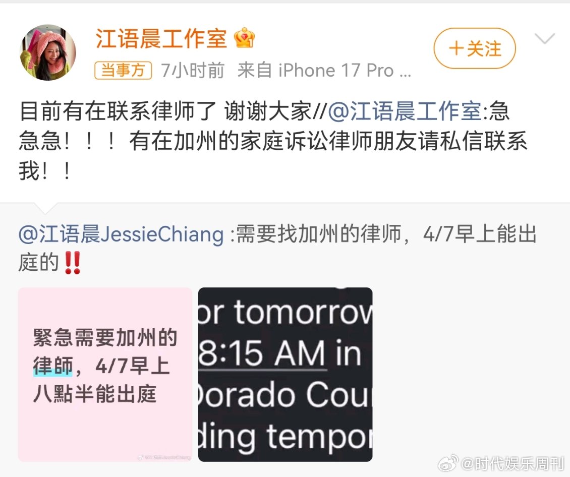江语晨疑似与前夫争孩子抚养权江语晨疑似打官司争孩子抚养权 江语晨凌晨发文求助找律师,疑似是要与美籍前夫争夺孩子抚养权姐姐一边参加浪姐还要一边打官司,真的好辛苦啊 希望姐姐一切顺利 江语晨急寻律师