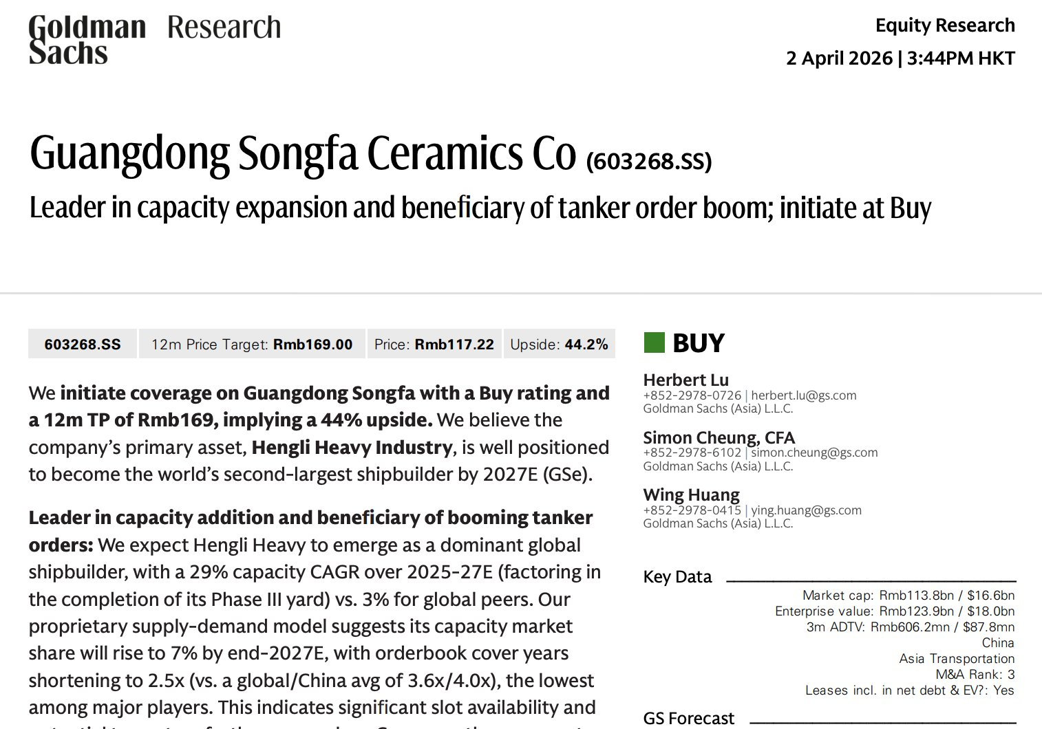 高盛首次覆盖松发股份(ST松发),用40页内容深度研究,给予目标价169元。——