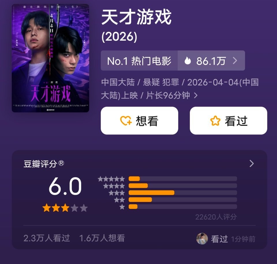 天才游戏开分6.0 彭昱畅,丁禹兮主演悬疑犯罪电影《天才游戏》豆瓣开分6.0,及格啦!