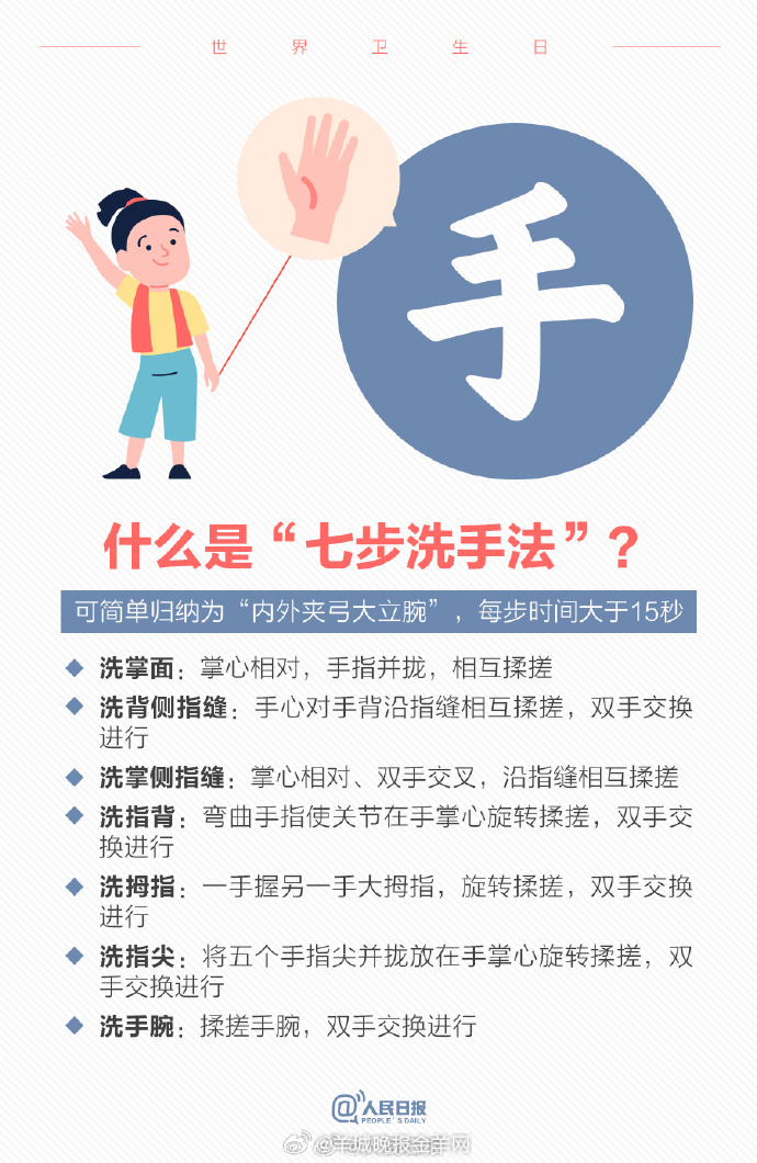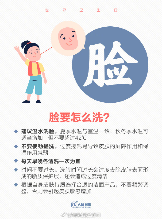 【#长大了重新学一遍的卫生常识#】①洗手遵循“内外夹弓大立腕”,每步时间大于15秒;②眼睛干痒时不要揉,可适当使用毛巾冷敷;③健康人耳道自带自洁功能,不当掏耳反而有害;④每日早晚各刷牙一次,每次不少于3分钟……今天世界卫生日,保持#眼耳口鼻手头脸肛#卫生,为健康,收藏!