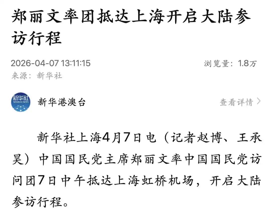 4月7日中午,新华社、央视新闻发布权威消息,郑丽文率团已顺利抵达上海虹桥机场,正式开启此次大陆参访行程。