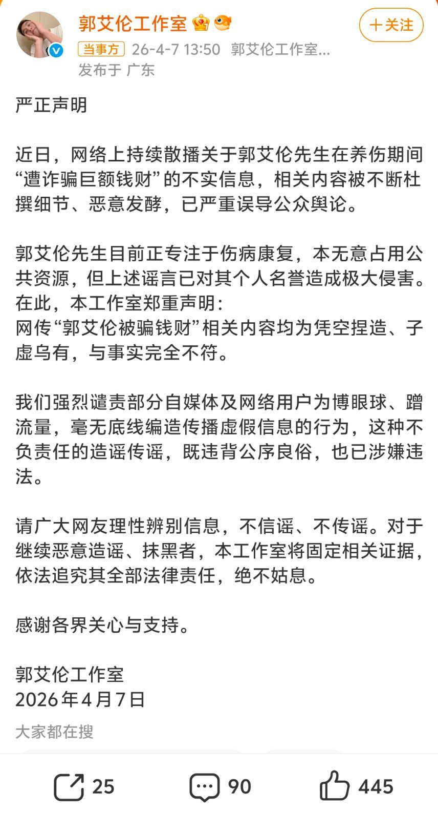 郭艾伦否认被骗郭艾伦工作室声明 重磅回应