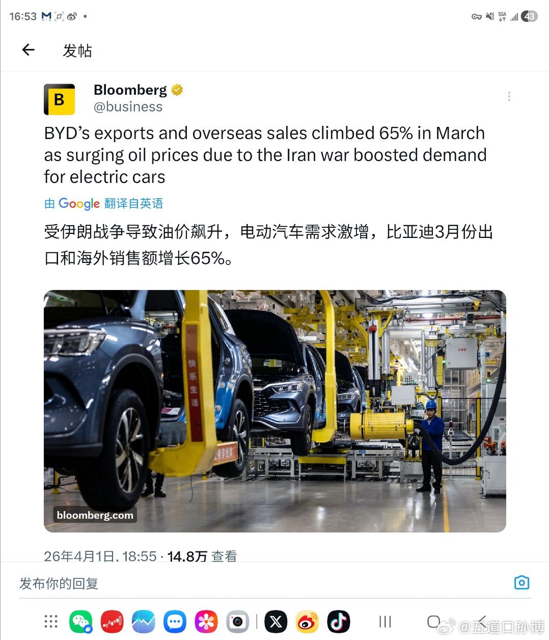小时光 2 2026-04-07 22:16 好像没有博博社这个媒体呢? 名满华夏 回复 04-07 22:46 年初稳妥起见,不贻人口实,落人话柄。扮猪吃老虎,130万轻轻松松,唾手可得。表面上尊重而不超过奇瑞,位居其后,掩盖锋芒,深藏不露。奇瑞:迪子你骗谁呢,花旗,摩根与高盛都早预测你今年有150万+海外销量,成就不在我之下。这不,彭博也言之凿凿啦?
