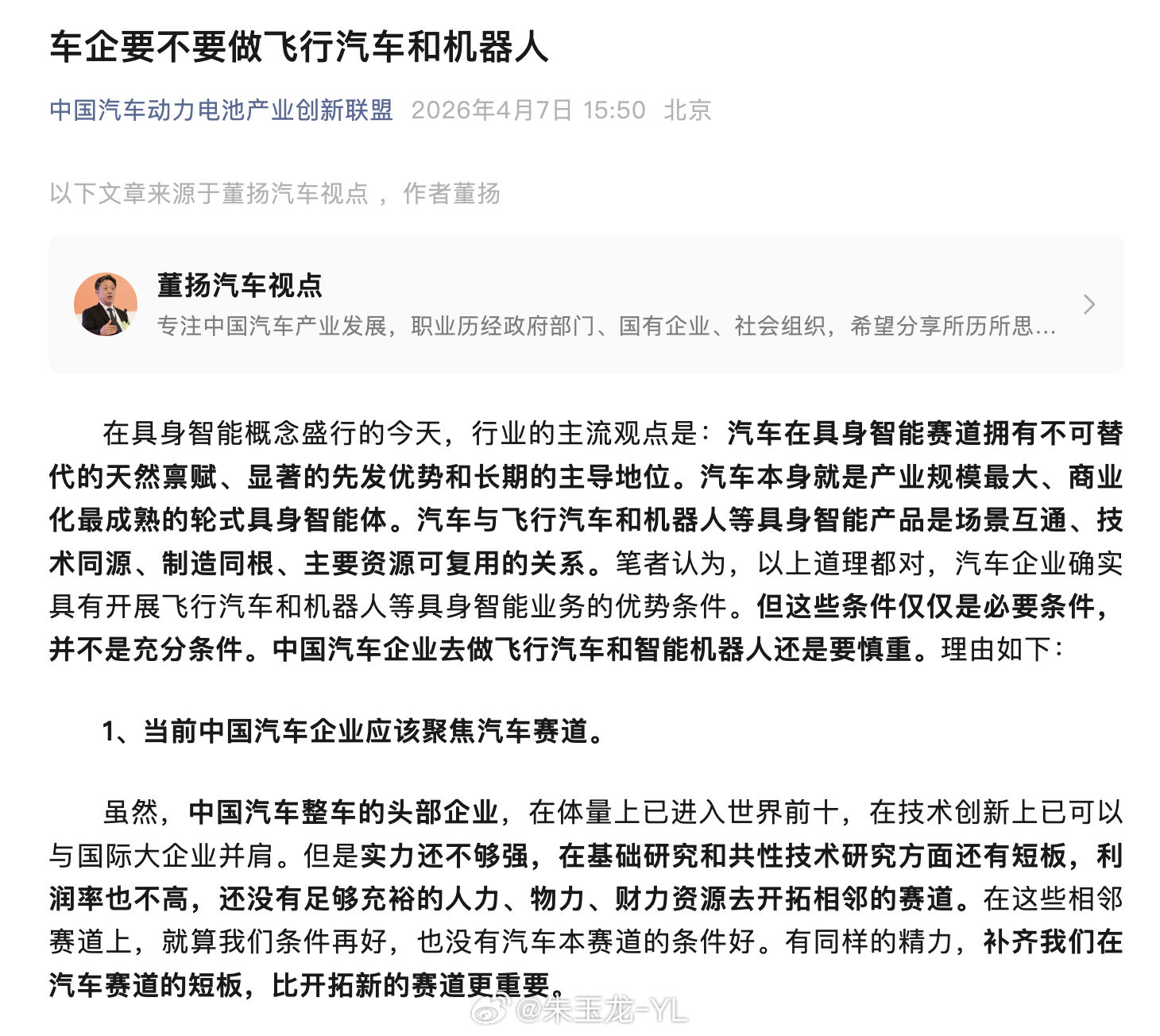 一开始没看懂,这个问题应该留给所有人,车企要不要做“飞行汽车和机器人”?