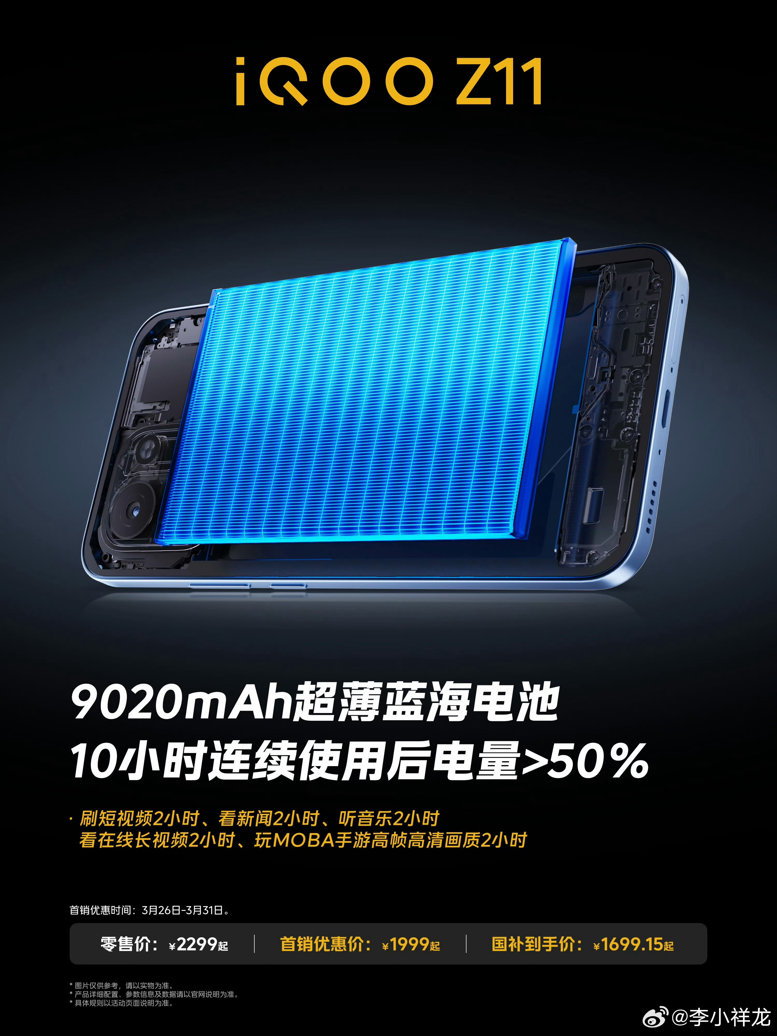 iQOO Z11搭载iQOO手机史上最大的9020mAh超薄蓝海电池,采用第四代硅负极和全新第二代半固态电芯,电池更轻薄续航更持久,同时支持90W闪充和反向充电。