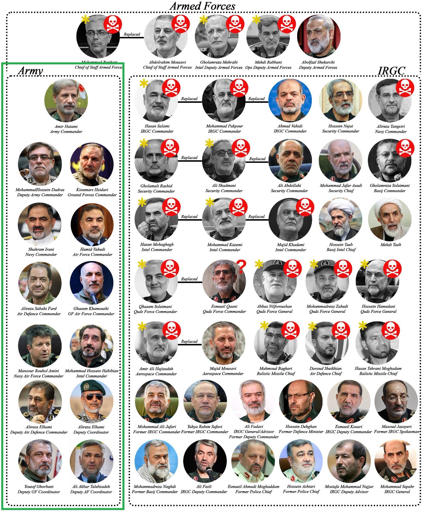 伊朗总统说已准备好牺牲¹ 一张很好的斩首总结图:伊朗各个系统被斩首情况。² 注意看军队系统。伊朗有两套军队系统,一个国防军,一个权力更大的卫队,后者高级指挥层几乎被斩首一遍。颇壮观。热点科普