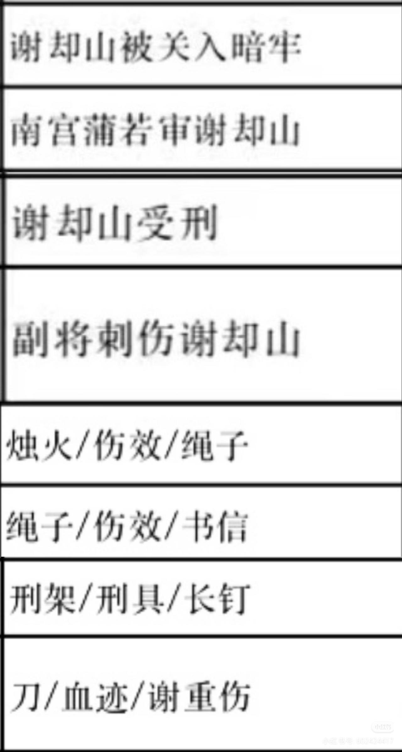 副将刺伤谢却山,烛火/伤效/绳子,绳子/伤效/书信,刑架/刑具/长钉,刀/血迹/谢重伤……