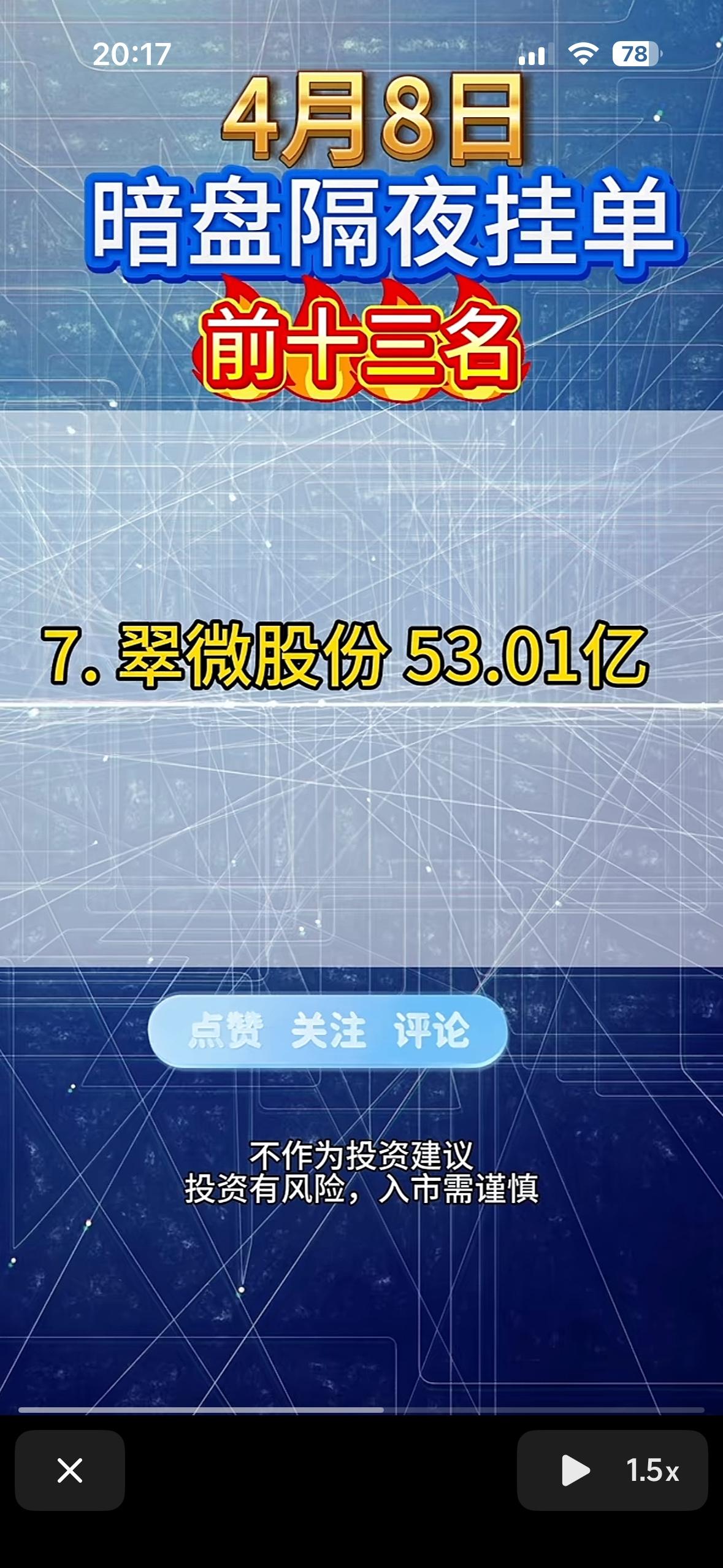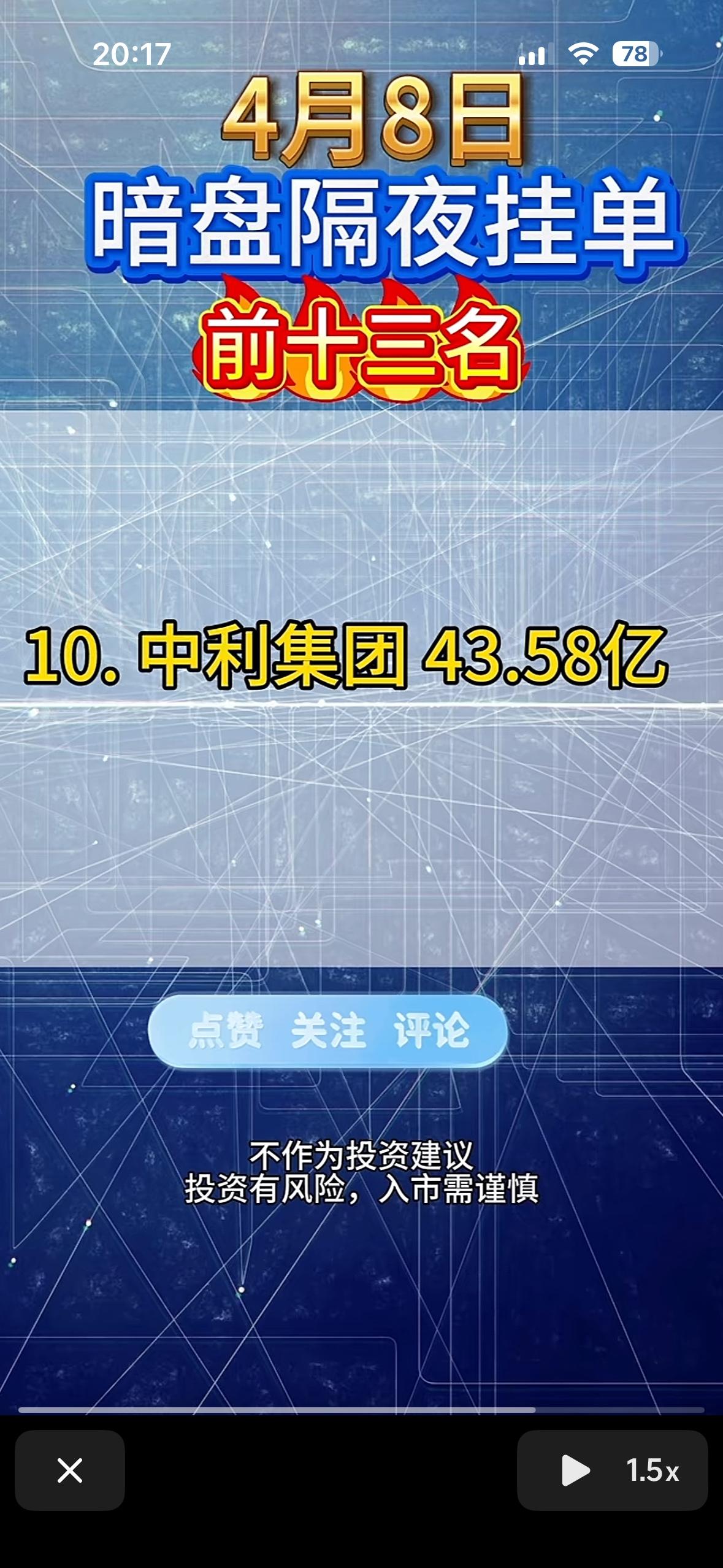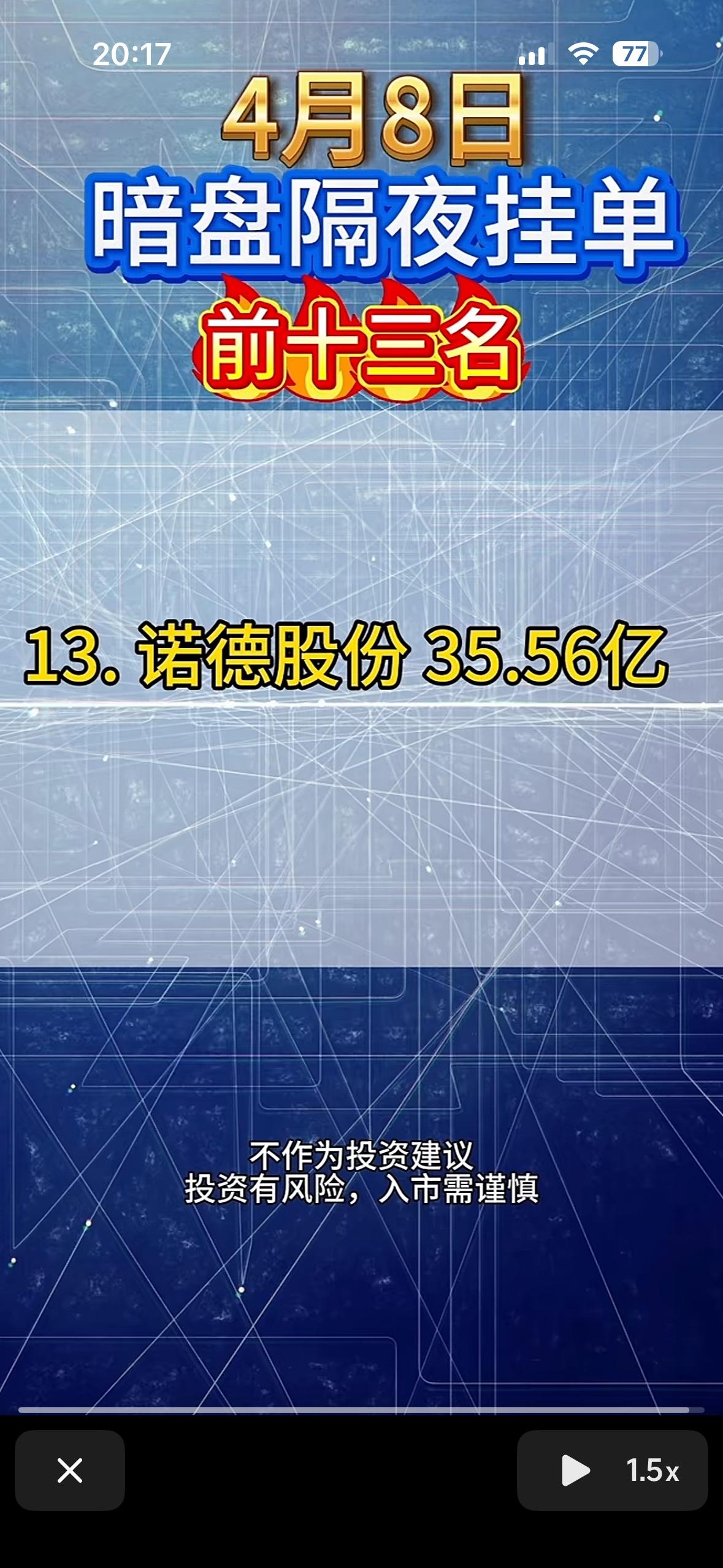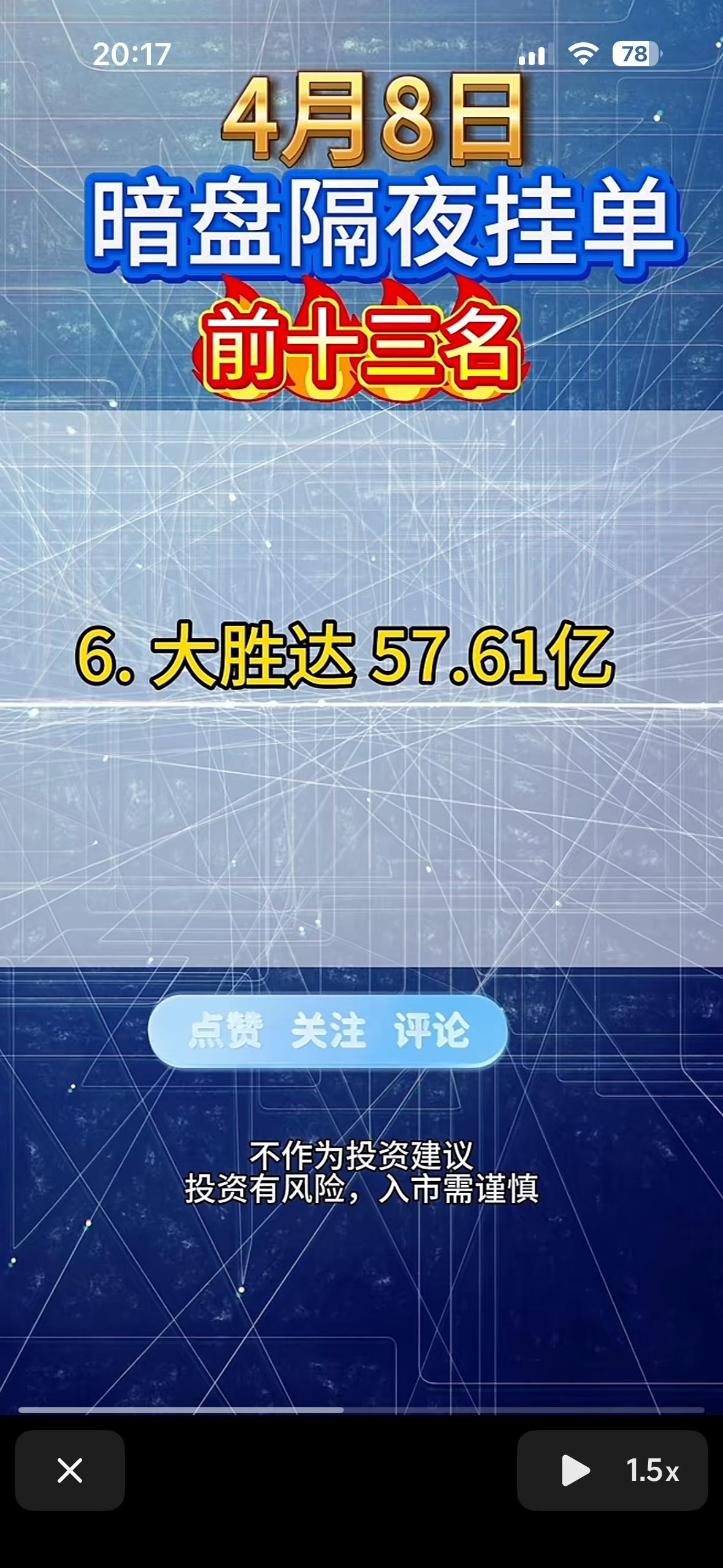 4月8日周三暗盘隔夜挂单榜前十三名揭晓 这可太让人期待了!股票市场就像一片充满未知的海洋,暗盘隔夜挂单更是其中神秘的一角。 想想4月7日暗磐隔夜挂单排名前八,就引发了不少关注。高盛预计系统化资金重新转向买入美股,这又会给市场带来怎样的波澜呢?还有像冲刺美股最大工业类IPO的Madison Air,拟最高融资22.3亿美元,它会不会在榜单上占据一席之地呢? 不过股票投资风险与机遇并存,就像散户精心挑选的股票,常常刚涨一点就被洗出局。咱还是得谨慎,多关注市场动态,才能在这片海洋里稳稳前行。