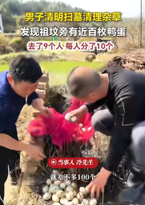“天上掉馅饼了!”近日,江西九江,一男子和亲戚回老家扫墓,见祖坟周围都是杂草,便开始动手清理,没想到清理干净后,发现竟散落着近百枚鸭蛋,众人又惊又喜,说这是太奶送来的福气,最后将鸭蛋全部平分!网友:鸭妈妈回来天塌了!