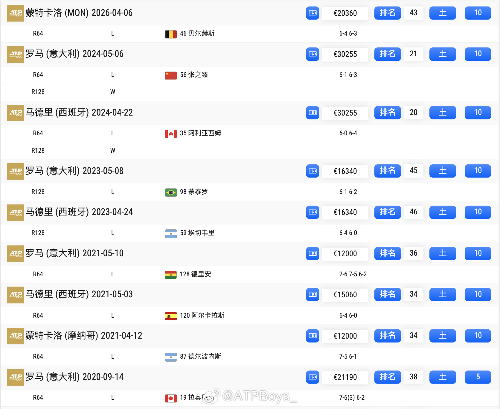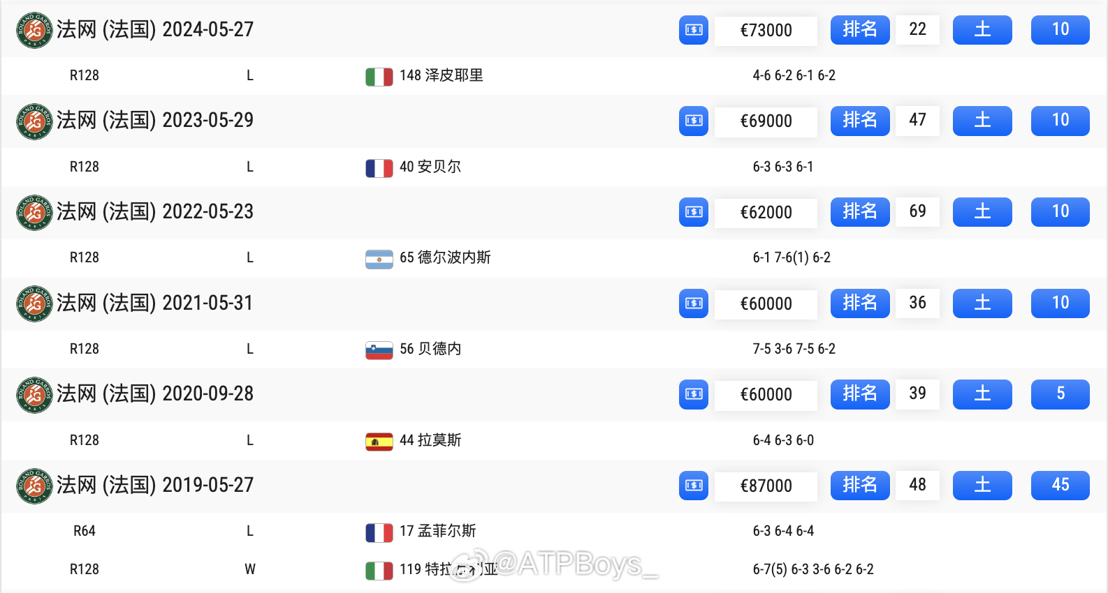 无人在意的角落,马纳里诺上一次在ATP500级别的红土赛事赢球,已经要追溯到2019年法网……