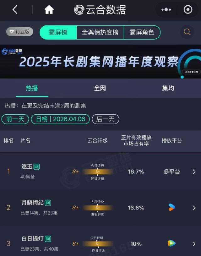 《逐玉》又苟了一天,《月鳞绮纪》开始单更,云合占比下降,目前依旧暂列第二,未超《逐玉》,《月鳞绮纪》目前能排在今年第二,日播放量比白鹿《唐宫奇案》走势要好,毕竟这部剧才29集,最终集均有破3000万的趋势,当初官宣的四人平番,但是曾舜晞和陈都灵戏份明显少很多,从40集删到29集,看来他俩戏份删的最多,郭敬明还是太偏爱田嘉瑞了,他和鞠婧祎不搭,曾舜晞和陈都灵挺有CP感的。