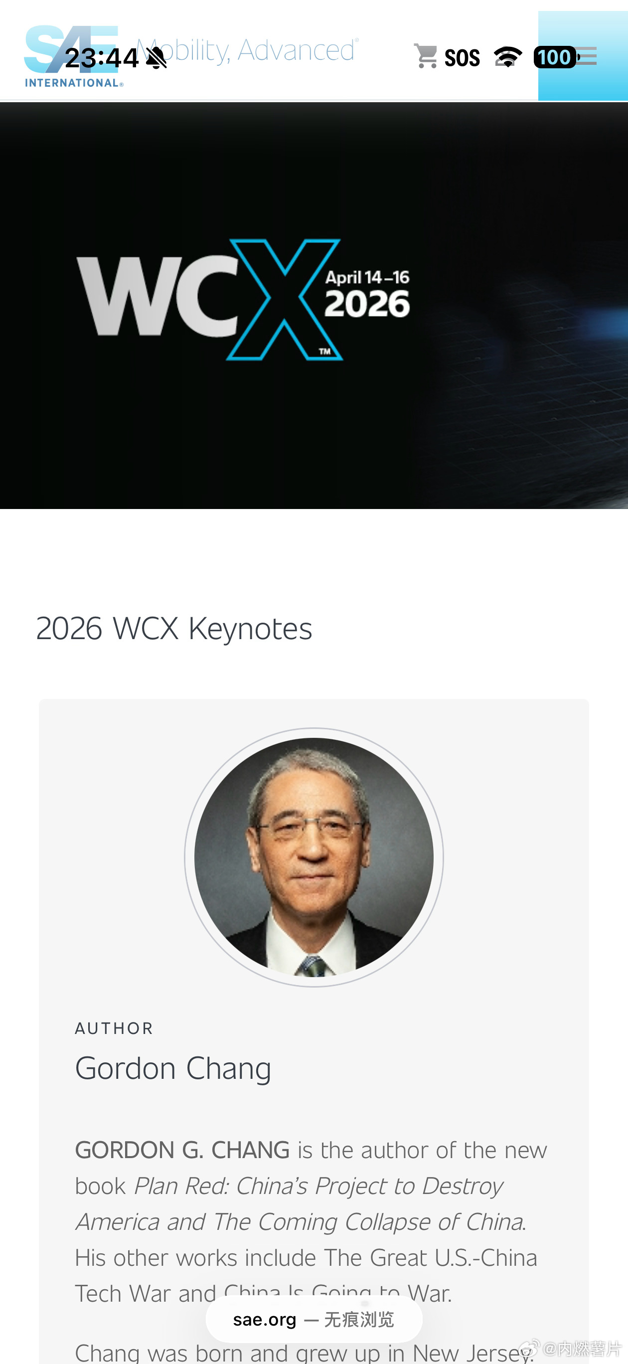 有几个教授去丑国参加 SAE WCX 峰会了,本来想看看今年的议题,结果一看第一位嘉宾居然是章家敦。