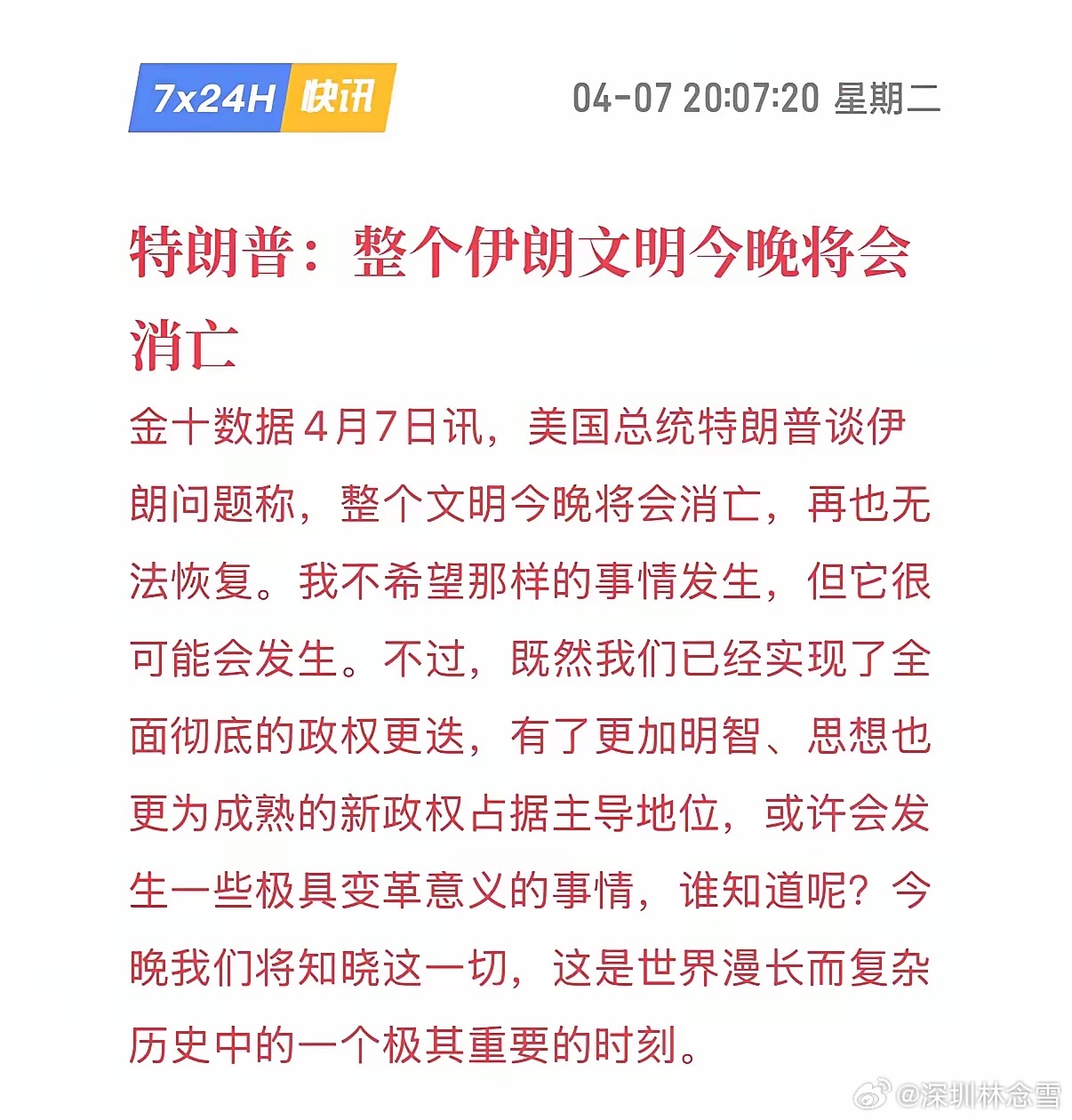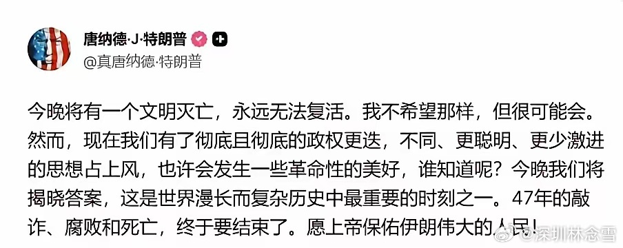 懂王深夜再放狠话,直接在社交平台称:伊朗文明今晚将永远消失。