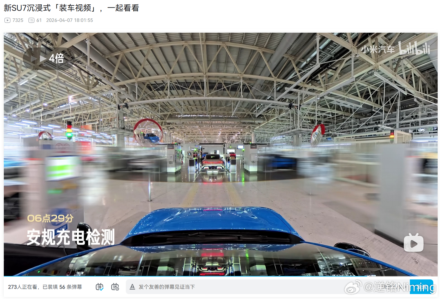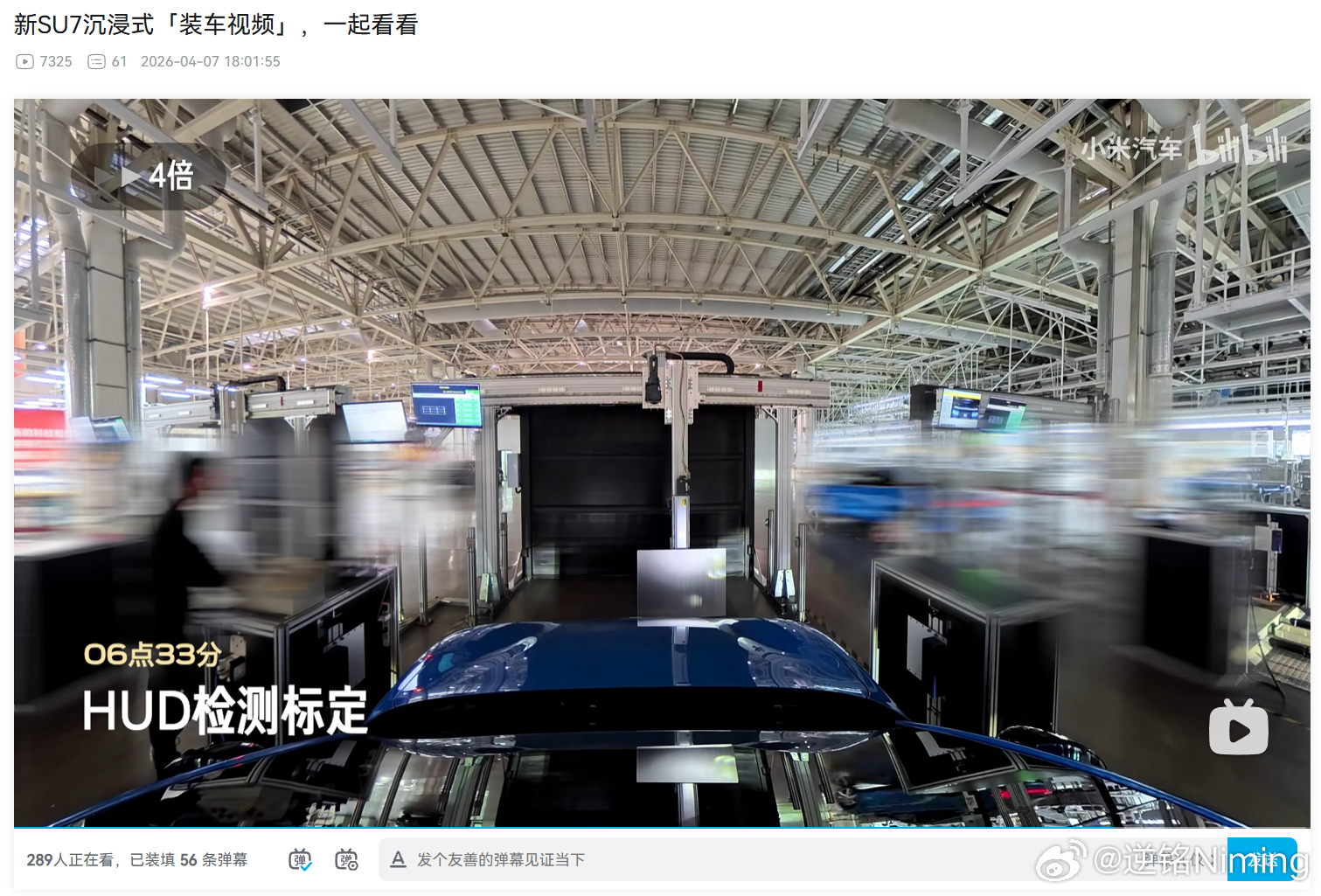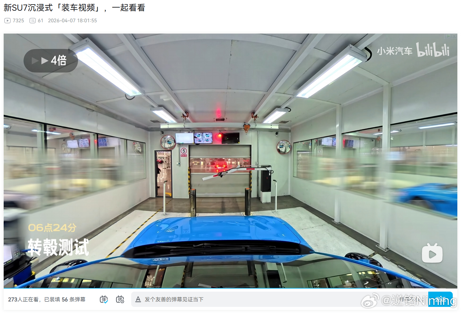 是的,在这辆车检测的这个过程,工厂也在正常进行汽车生产,从画面里可以看到,它的前面就是一辆正常生产的雅灰SU7。我们还能从画面的时间标注里,看到小米汽车工厂目前确实是24小时运转,加班加点给大家生产新车。