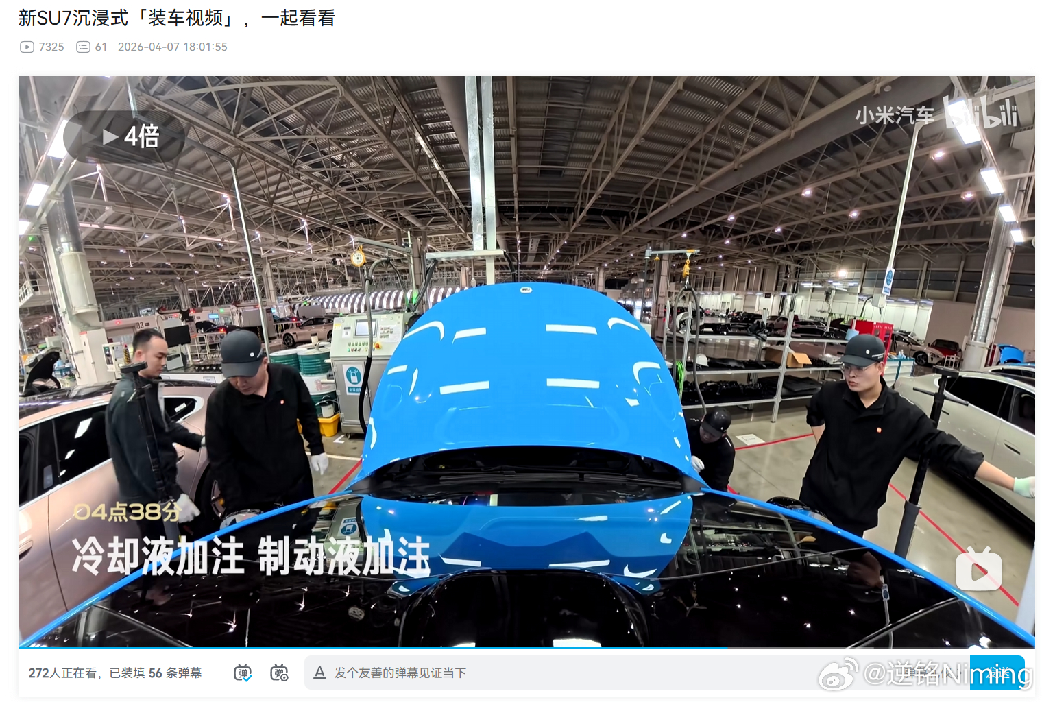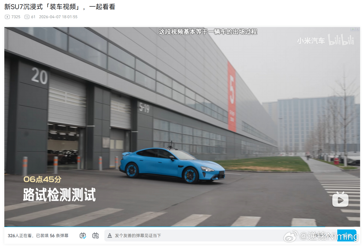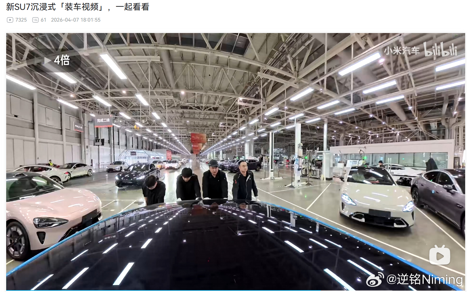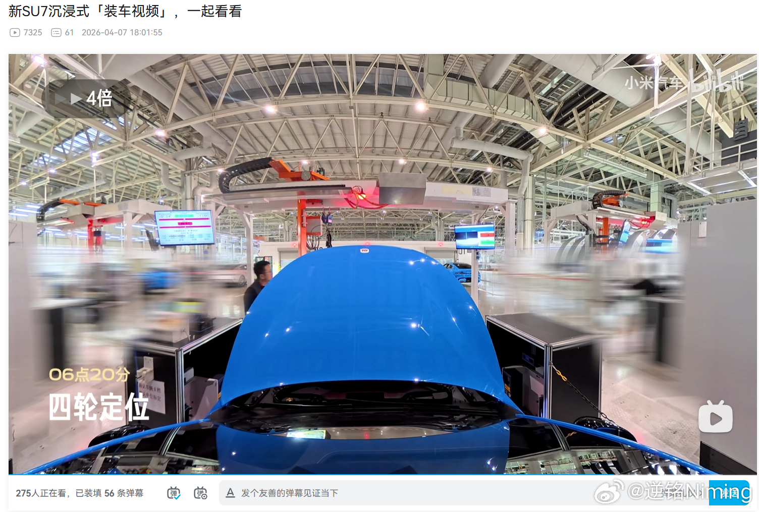 是的,在这辆车检测的这个过程,工厂也在正常进行汽车生产,从画面里可以看到,它的前面就是一辆正常生产的雅灰SU7。我们还能从画面的时间标注里,看到小米汽车工厂目前确实是24小时运转,加班加点给大家生产新车。