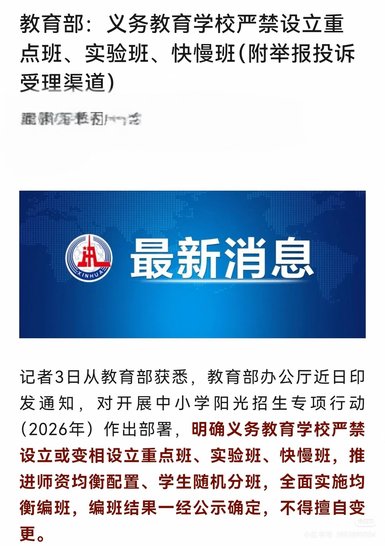 对开展中小学阳光招生专项行动(2026年)作出部署,明确义务教育学校严禁设立或变相设立重点班、实验班、快慢班,推进师资均衡配置、学生随机分班,全面实施均衡编班,编班结果一经公示确定,不得擅自变更。