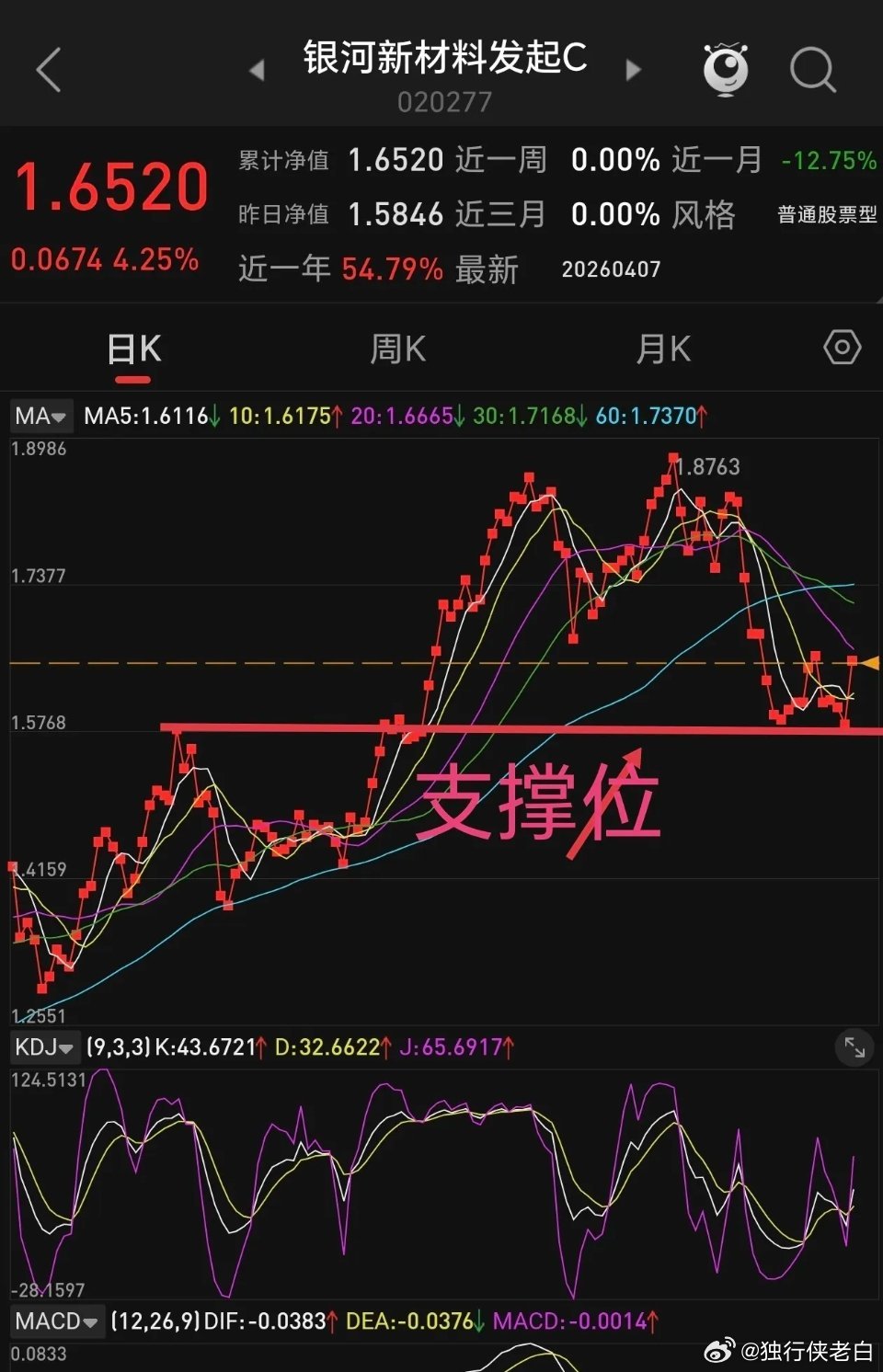周二这个板块大涨近3%,平时大家不怎么关注,最近止跌企稳回调到位,不妨观察一下,前面走势比半导体板块抗跌,日线macd即将金叉,短线有走好趋势。代表基金银河新材料发起,昨天大涨超4%。国泰聚信我是相关基金,目前都守住了支撑位。本文只是交流,不是推荐买卖,盈亏自负。
