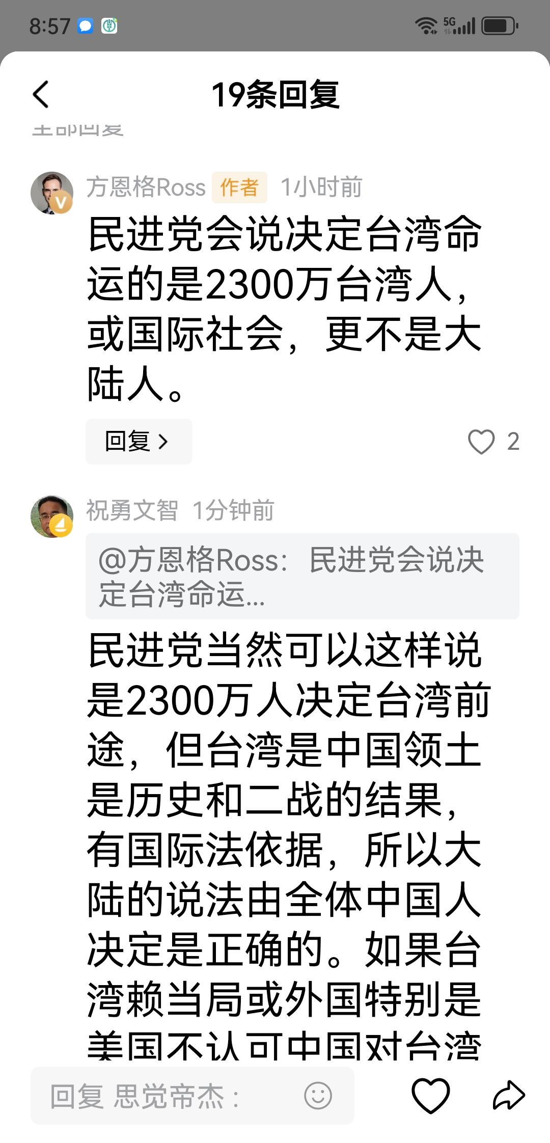 台湾美国籍犹太人方恩格说:民进党会说决定台湾命运的是2300万台湾人,或国际社会,更不是大陆人。 民进党当然可以这样说是台湾人人决定台湾前途,但台湾是中国领土是历史和二战及内战的结果,有国际法依据,所以大陆的说法由全体中国人决定是正确的。如果台湾赖当局或外国特别是美国不认可中国对台湾的主权,那最终只有通过战争来确认了,大陆是正义而文明的统一之战,如果外军参与则是侵略战争,中国大多数人会不惜牺牲与之战斗到底。美国会为台湾独立参与阻止统一吗?也许会,但可能会得不偿失一一美国霸权地位不保,而引发战争的台独分子会被彻底消灭。这就是大多数中国人的结论。
