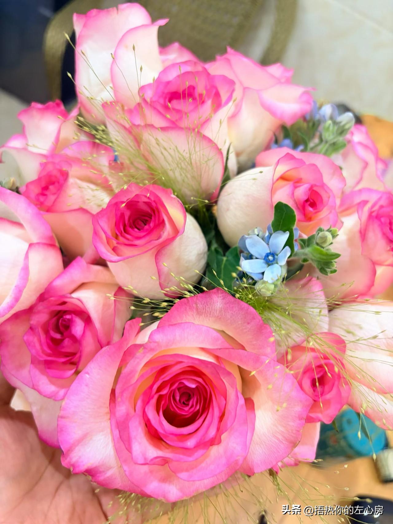 每一朵花都开得圆滚滚的,特别饱满,花瓣摸起来厚厚的,质感特别好。花束里还搭了几支小小的蓝色碎花,还有那种细细的、像小喷泉一样的草,一下子就把灵动感拉满了,不会显得单调死板。随手拍了两张,不管是对着光拍还是放在桌上拍,都巨出片,完全不用加滤镜。