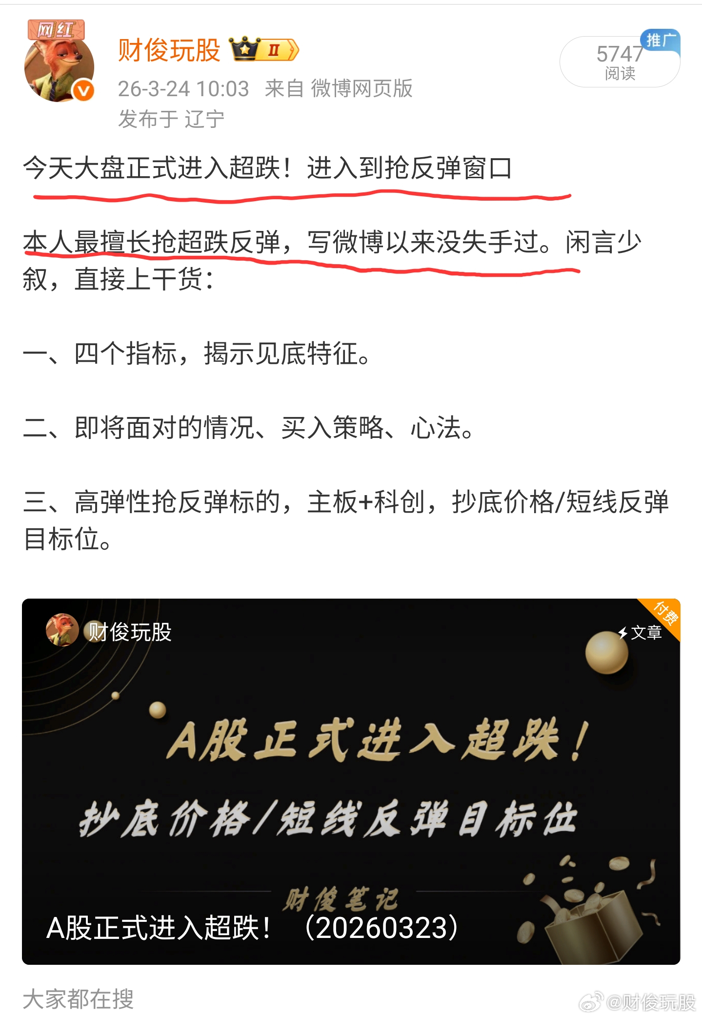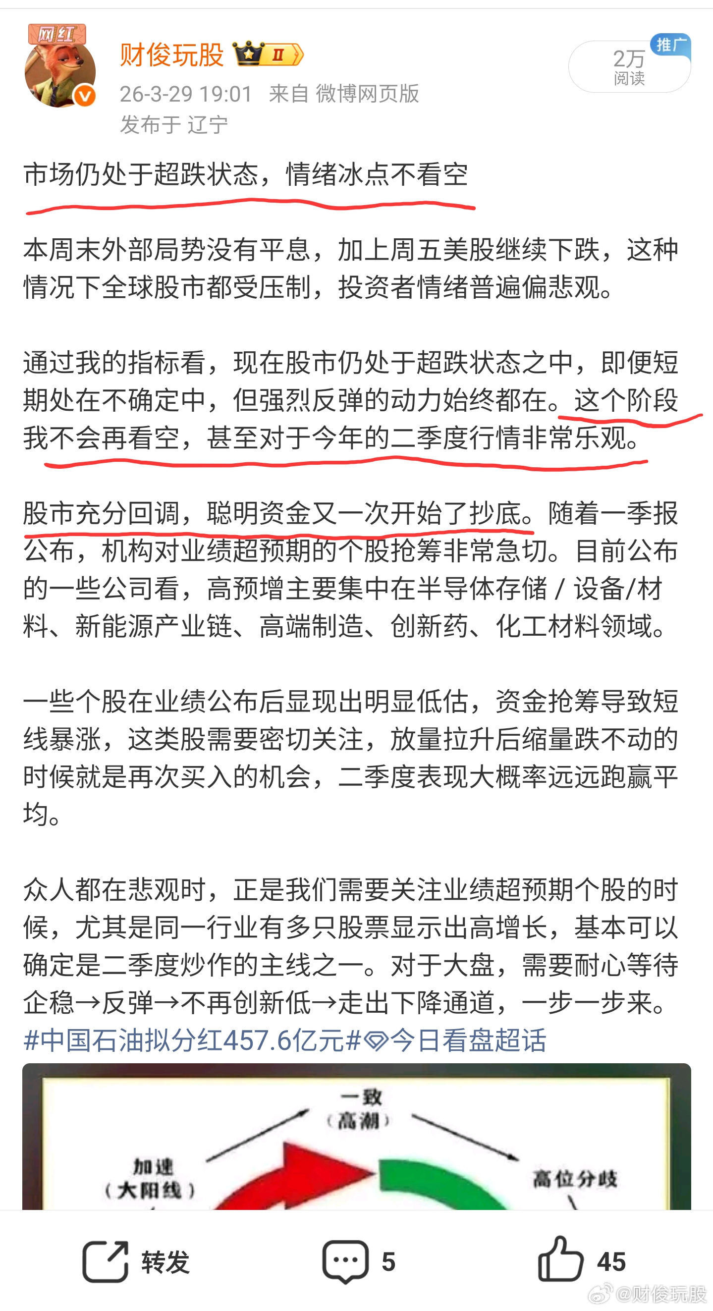 自从3月13日大盘首次超跌,我陆续写了多篇长文给大家信心,超跌反弹的机会一定要抓住。后面A股多次阴霾不定,外围局势不确定、存储行业鬼故事等,都在时刻牵动投资者紧张的情绪,这时就需要有强大的逻辑才能守得住。又看见外面有人绝望割肉,令人开心的是我们坚持住了,还有很多人及时抄底抢到了反弹。