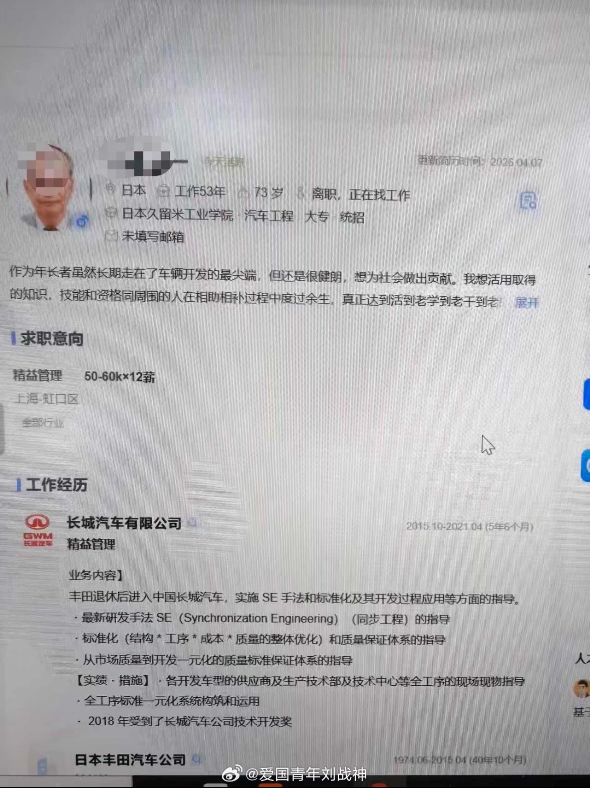 中国某车企HR近期收到了一份日本73岁求职者岁简历…..这本该颐养天年的年纪,却