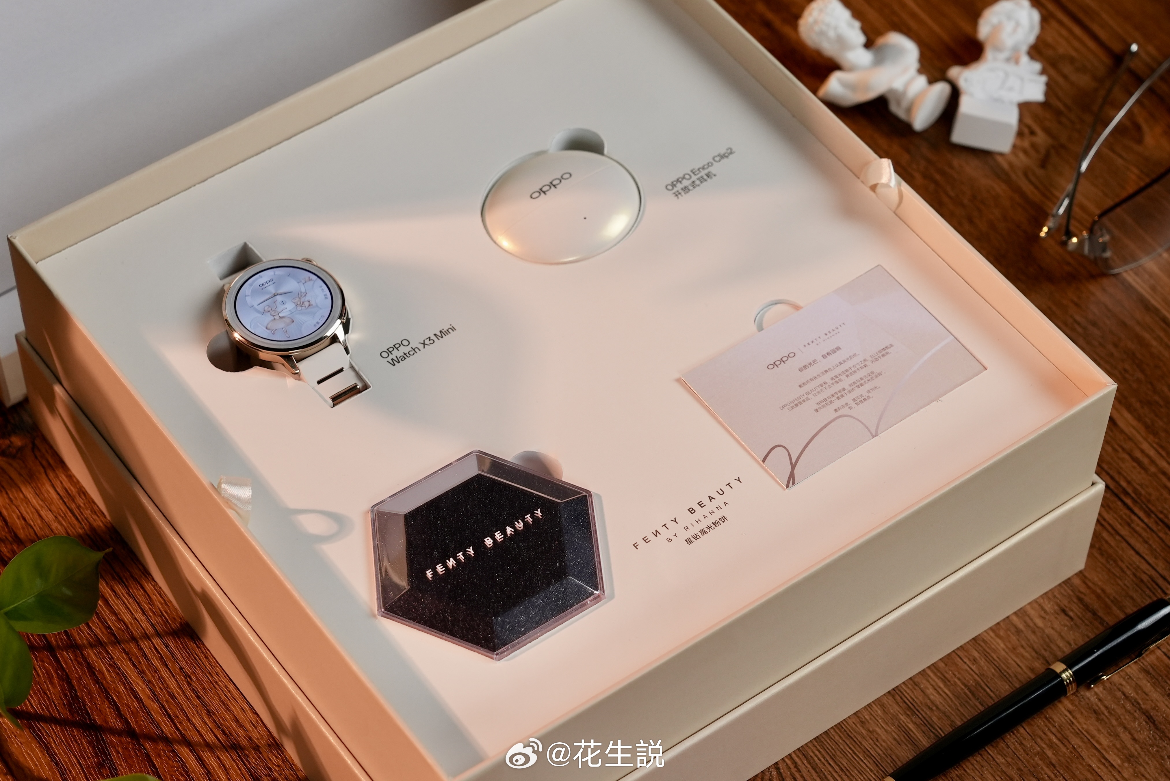 上代就广受好评的Watch X2 Mini和Enco Clip这次同时更新啦X3 Mini依旧延续了女表风格的小巧和精致,但是加上了更多的金色点缀,表壳上还模仿了钻石的纹理,主打一个奢华和高贵不止面子还有里子,X3 Mini也专门给女生定制了一些关怀功能,尤其是针对经期的“痛点”,不是简单的跟踪,还可以为生理期定制更合理的运动规划Enco Clip 2也很闪,这次的高光金和X3 Mini配合得很好,交相呼应了属于是,音质方面会有惊喜,特别是在耳夹领域如果这俩你都很喜欢,欸巧了OPPO还和FENTY BEAUTY合作,推出了礼盒装:我的高光时刻,这和高光金不就对上了嘛OPPOEncoClip2OPPO耳夹耳机OPPOWatchX3MiniOPPO手表
