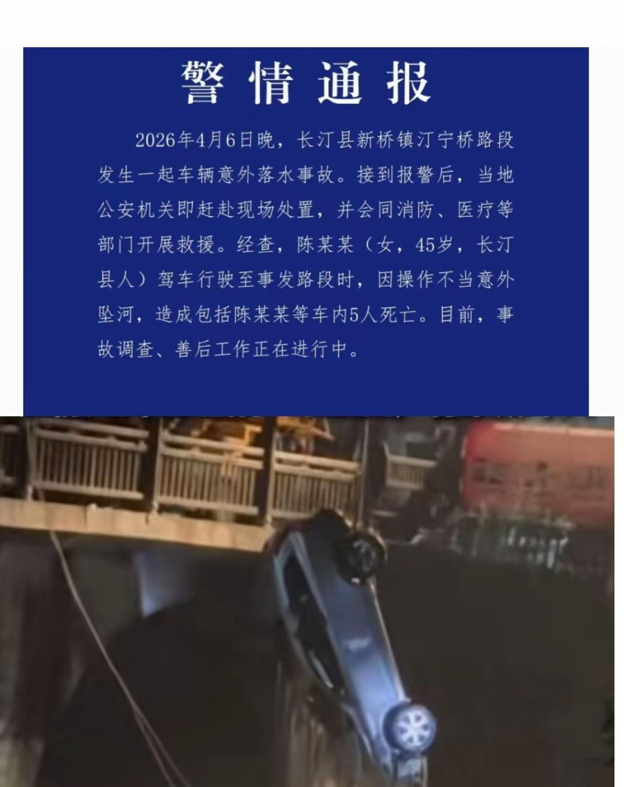 4月6日晚上10点多,福建长汀汀宁桥发生了一场让人揪心的悲剧,45岁女司机陈某某驾车,不小心冲进了暴涨的汀江,车上五个人全部没能救回来。