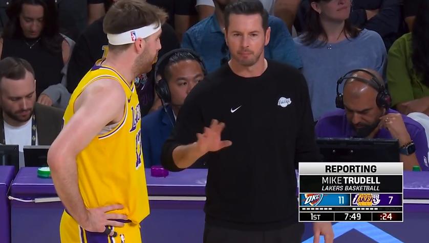 今天湖人主场打雷霆,目前湖人比分落后,比赛中出现非常有意思的画面,第一节打了2分多钟,湖人2-8落后,雷迪克看到球队没有一点防守想法,叫了暂停。