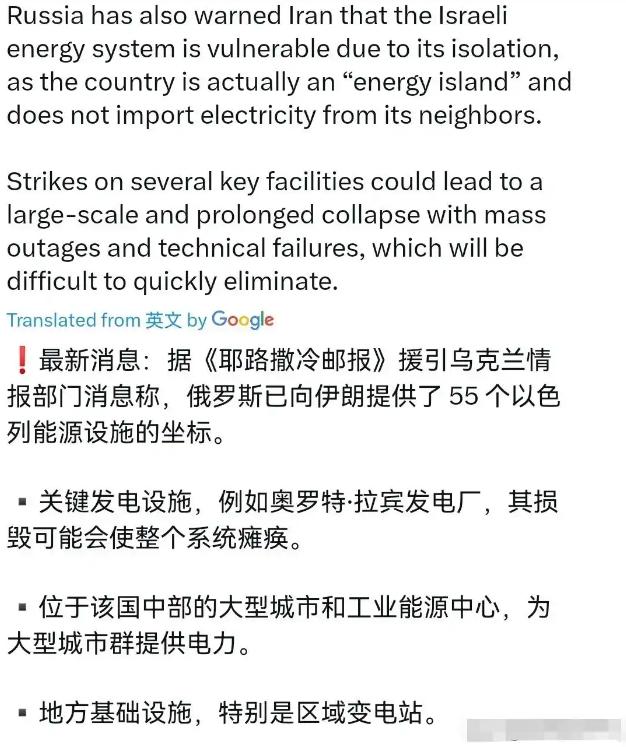 4月7日,根据《耶路撒冷邮报》援引乌克兰情报部门消息,该报表示,俄罗斯已向伊朗提供了以色列55处能源设施的坐标,这则消息若属实,对以色列来说无疑是致命打击,所谓的中东军事强国,在能源命脉被精准锁定后,脆弱性会被无限放大。