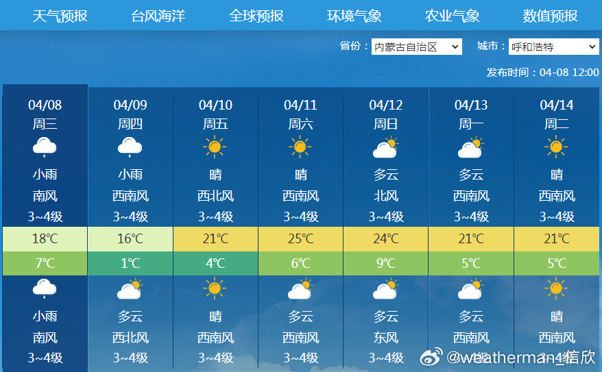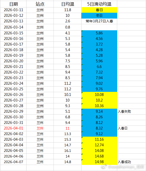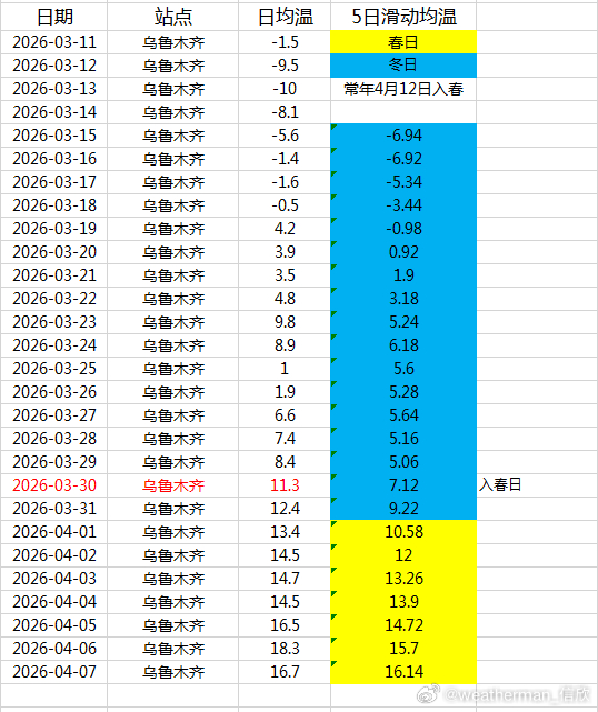 乌鲁木齐老国家站3月30日入春,提前13天(另外新疆地方采用均温0℃为冬春分界,因此地方标准入春时间更早一些)。另外新疆吐鲁番4月2日提前22天入夏(第三早)。从目前气温预报看,呼和浩特4月8日入春悬念不大,就等后续走流程。