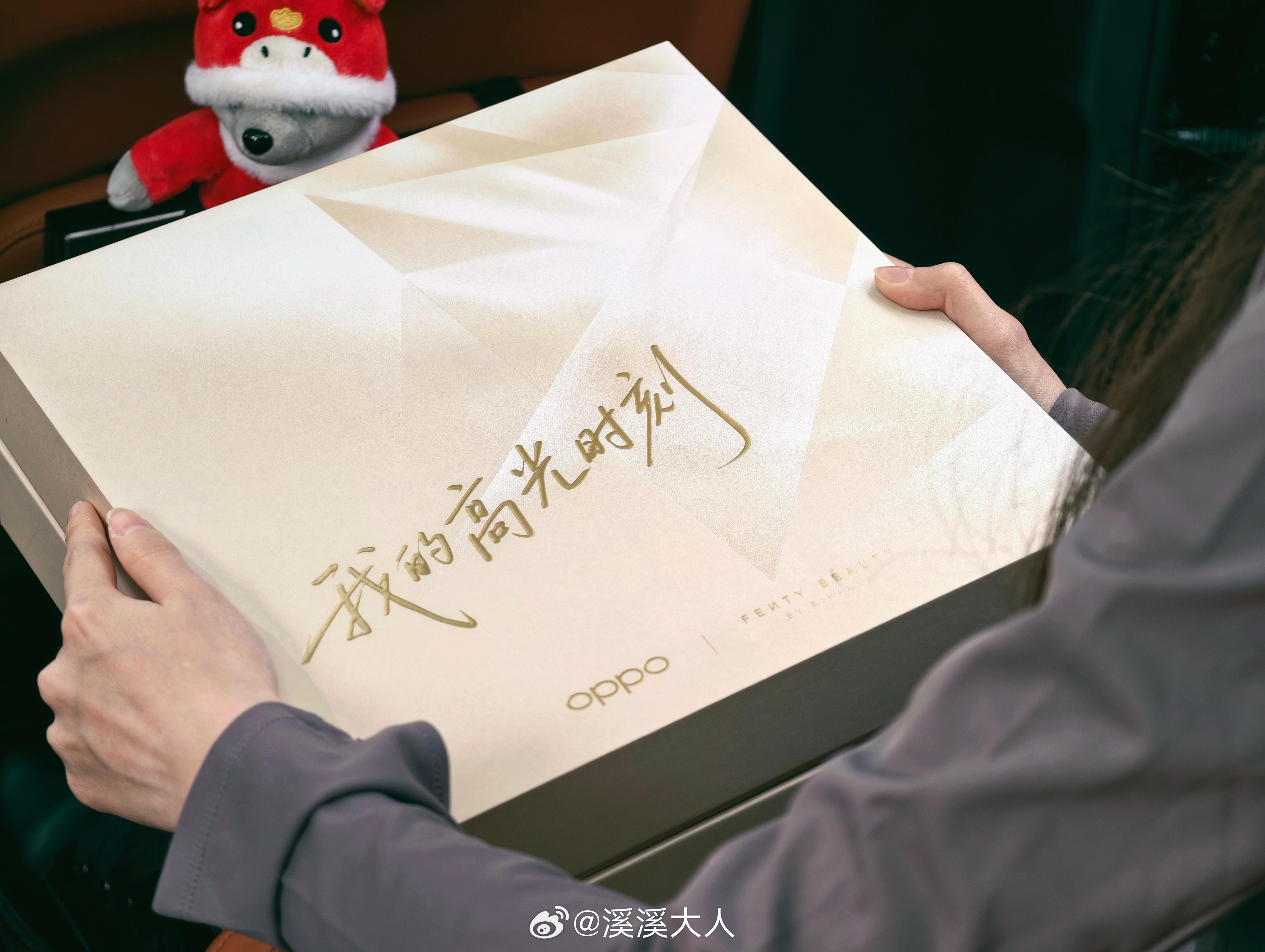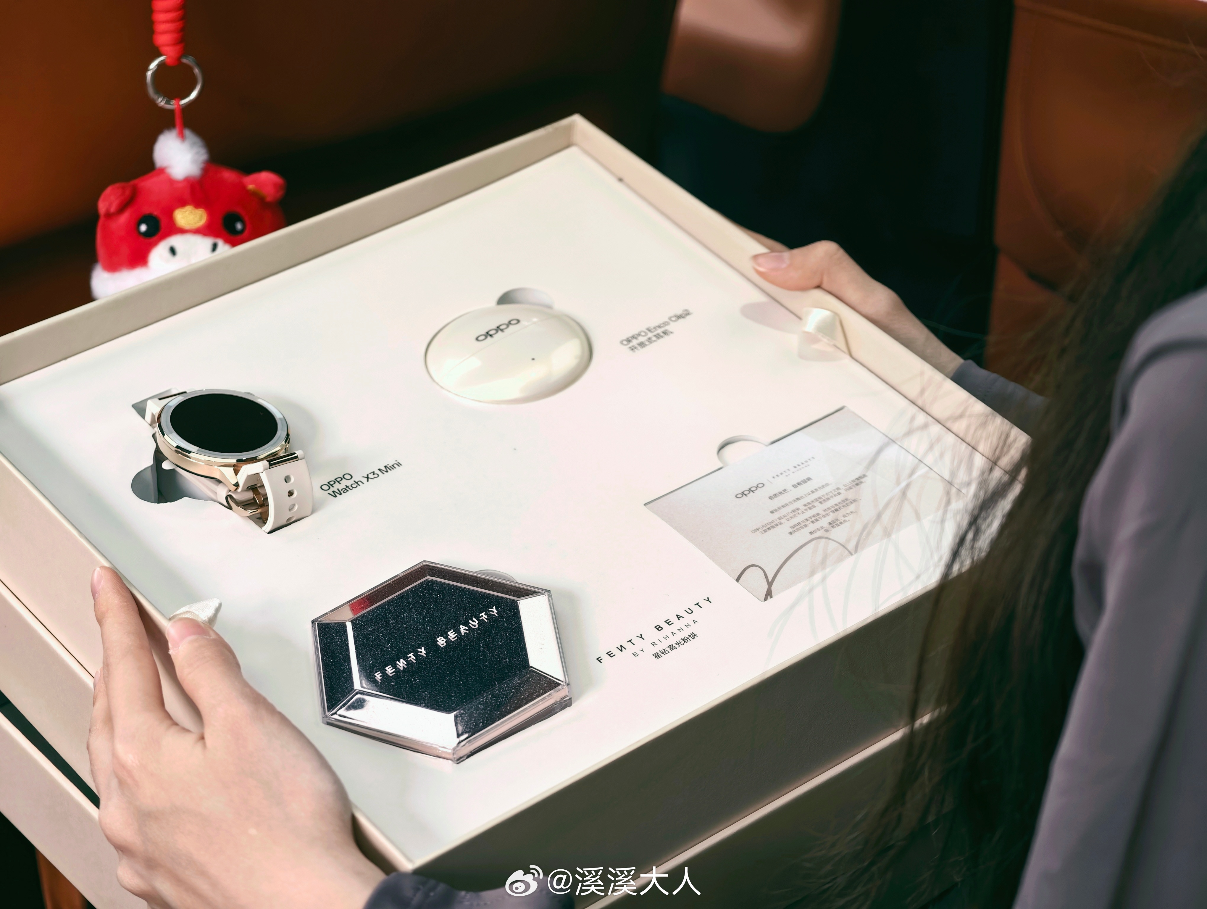 OPPO & FENTY BEAUTY联合打造的『我的高光时刻』套装,由一套高光金的OPPOWatchX3Mini OPPO手表、OPPOEncoClip2 OPPO耳夹耳机 ,以及Fenty Beauty的星钻高光粉饼组成,小巧精致,令人爱不释手。