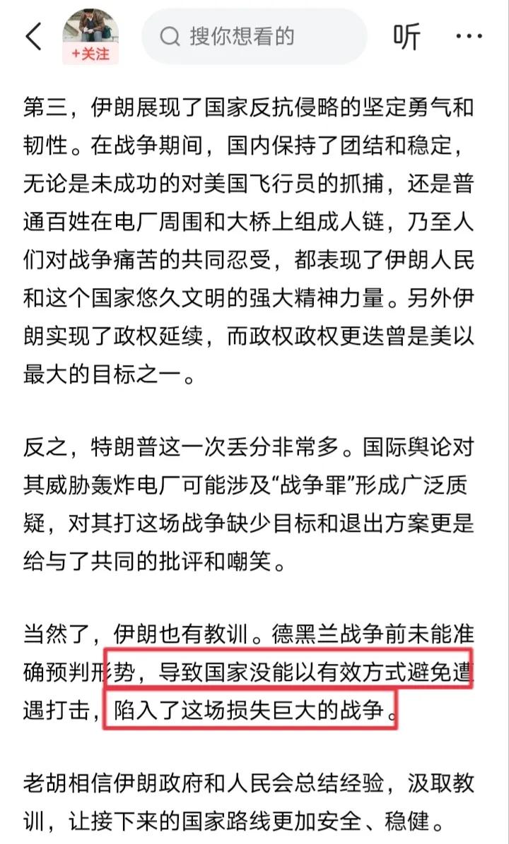 那么胡锡进闭口不谈侵略与反侵略,只会指责伊朗“未成功”、“没能以有效方式避免”、“损失巨大”等等,老胡一味避战、怯战为哪般呢?
