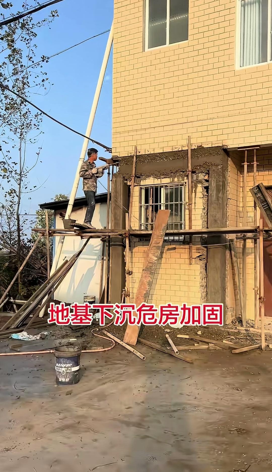 地基下沉引发墙体开裂,师傅打算通过开洞立柱架梁的方式进行加固,这样做会有效果吗? 针对面墙上因下沉出现的大裂缝,师傅没有采用常规方法,而是直接在面墙四周拆出一个“门”形洞,然后立柱架梁,用钢筋混凝土加固。从表面看,这样做似乎有一定效果,毕竟墙体的左、右、上三面已经连接在一起。 然而,没有深挖且下方未连接的柱子,能抵御地基再次下沉吗? 来评论区说说你的观点! 地基加固技术