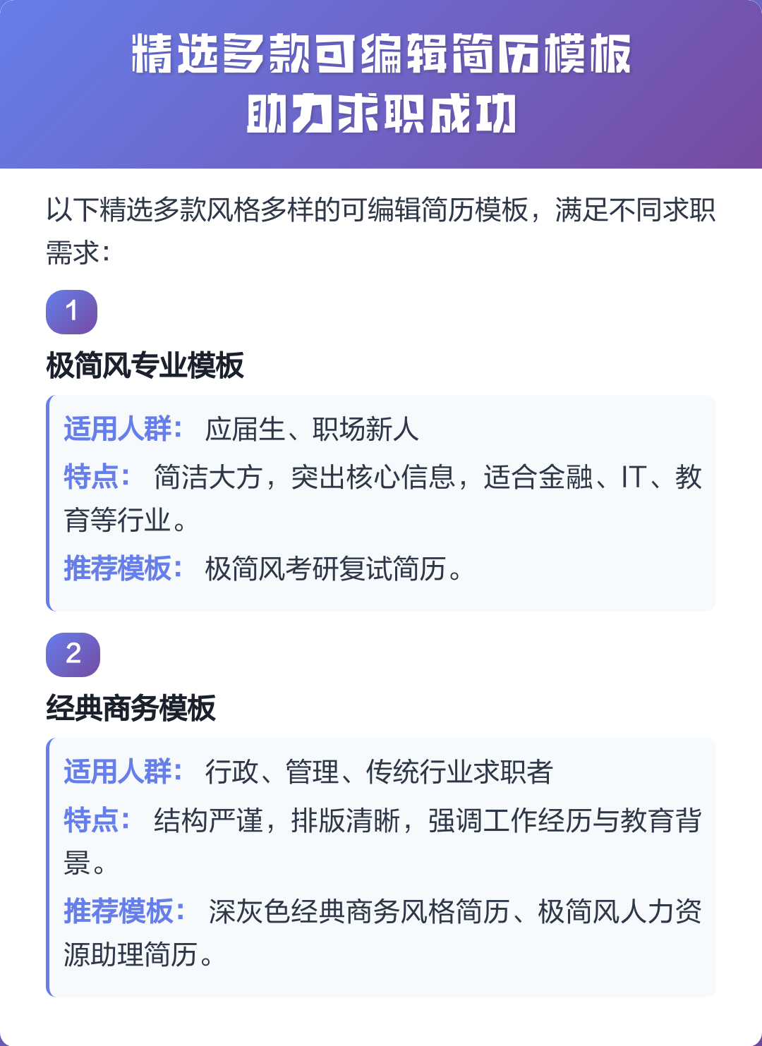 大学生用ai优化简历拿到多个offer 一份出色的简历是求职成功的第一步,而可编辑的简历模板能让你快速上手,轻松打造专业简历。以下精选多款风格多样的可编辑简历模板,满足不同求职需求。三无应届生用ai给简历精装修