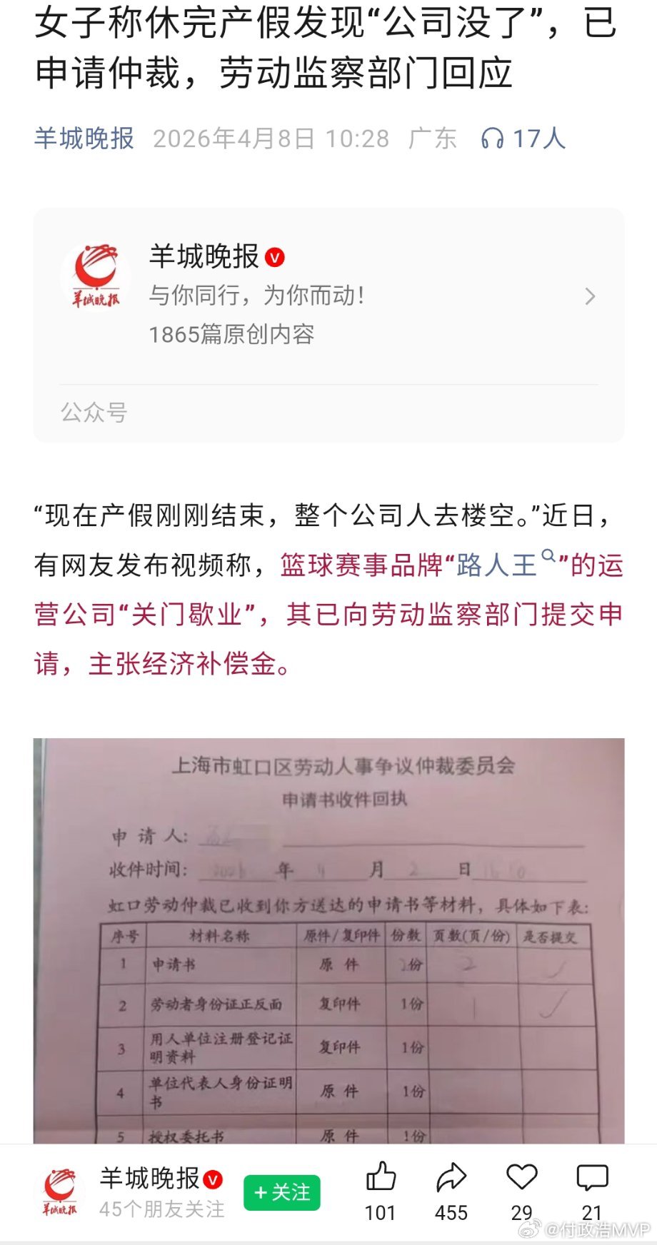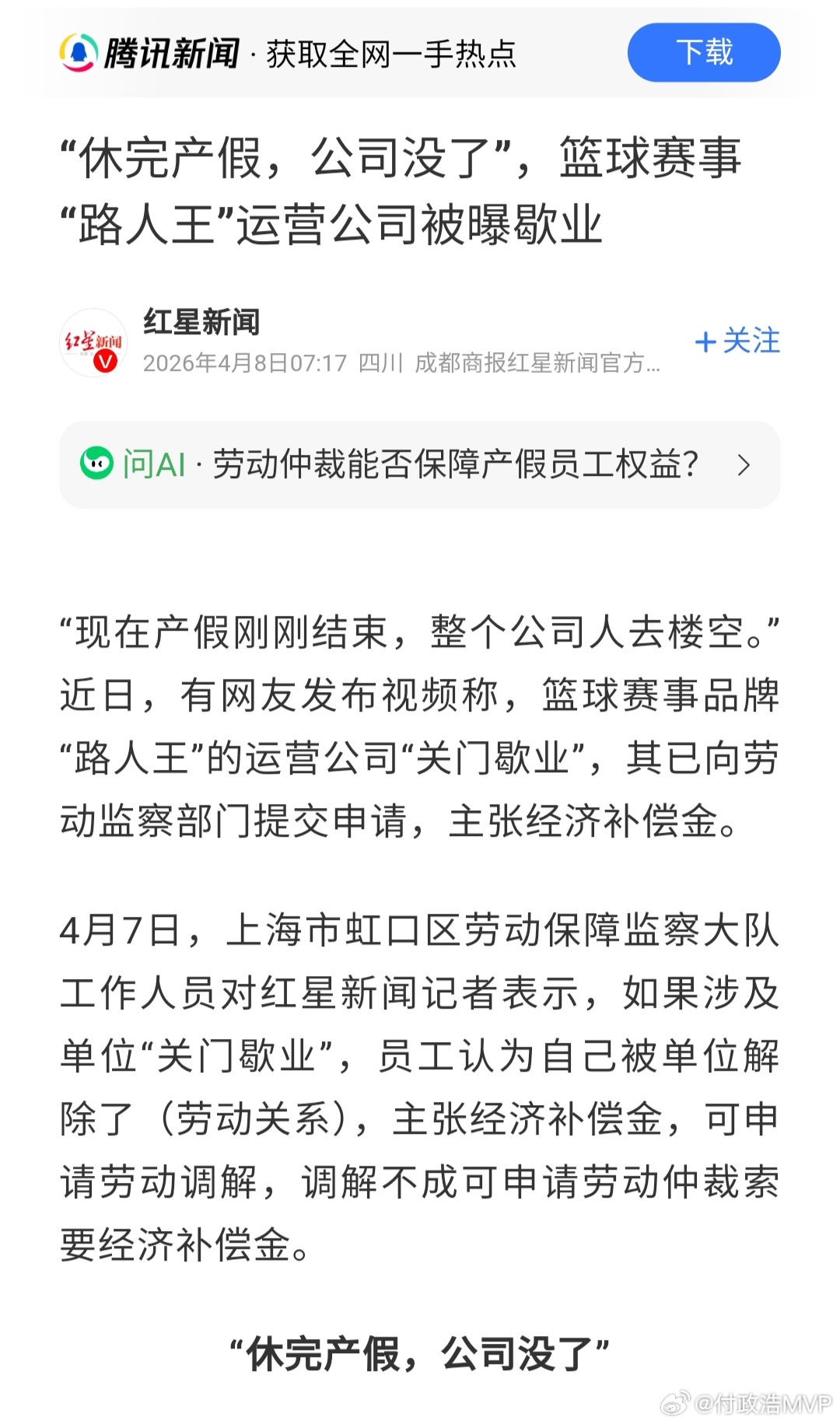 女子称休完产假公司没了 多家媒体报道了篮球赛事“路人王”运营公司关门歇业一事,令人顿生兔死狐悲之叹。