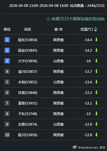 【气温波动】今天因为冷空气和阴雨影响,陕西山西河南多地出现6-14℃降温。陕西延长降14.4℃、山西大宁降14℃、河南漯河降11.5℃,为各自省份14时降温最强站点。从14时气温分布看,陕西山西一带出现明显的冷区。