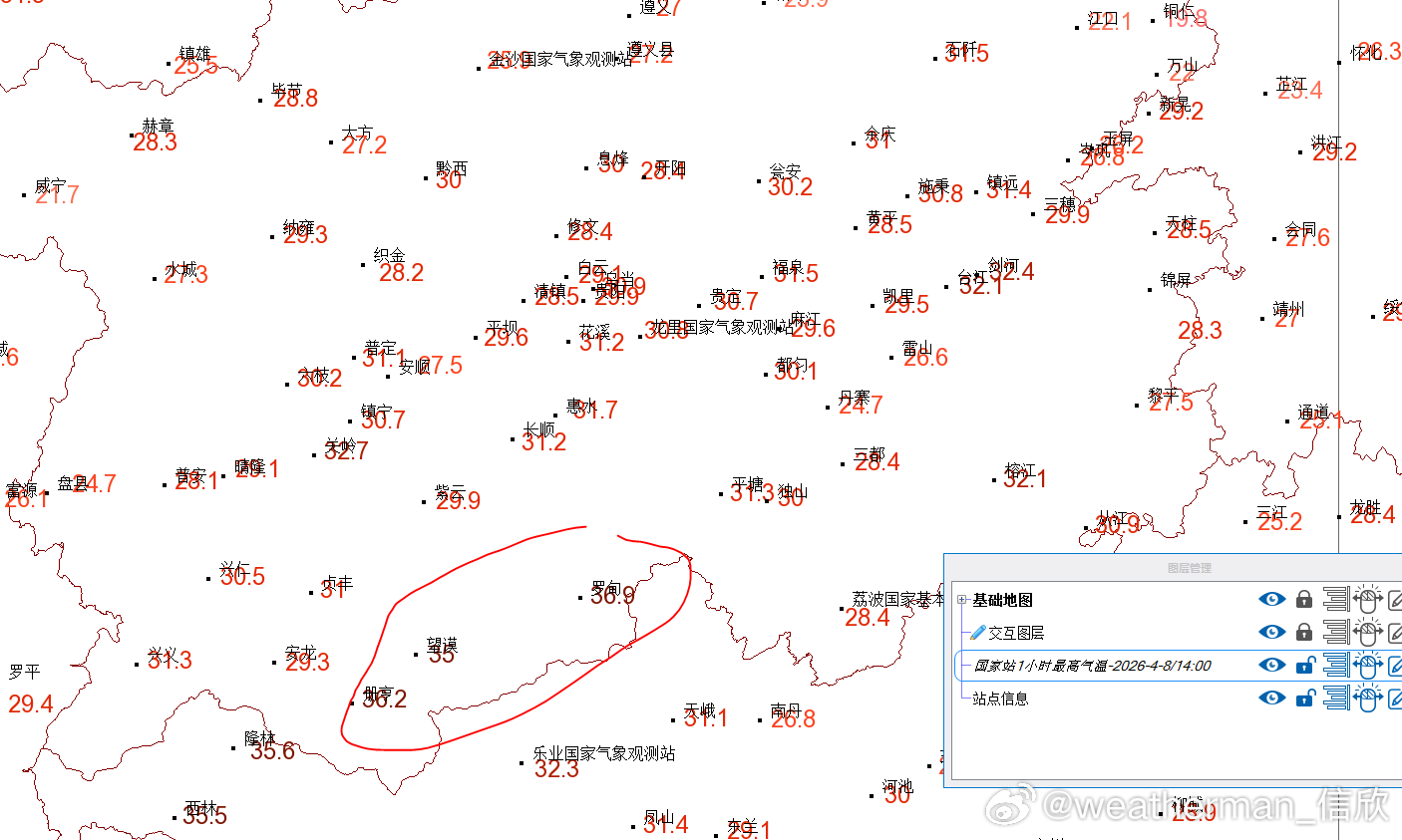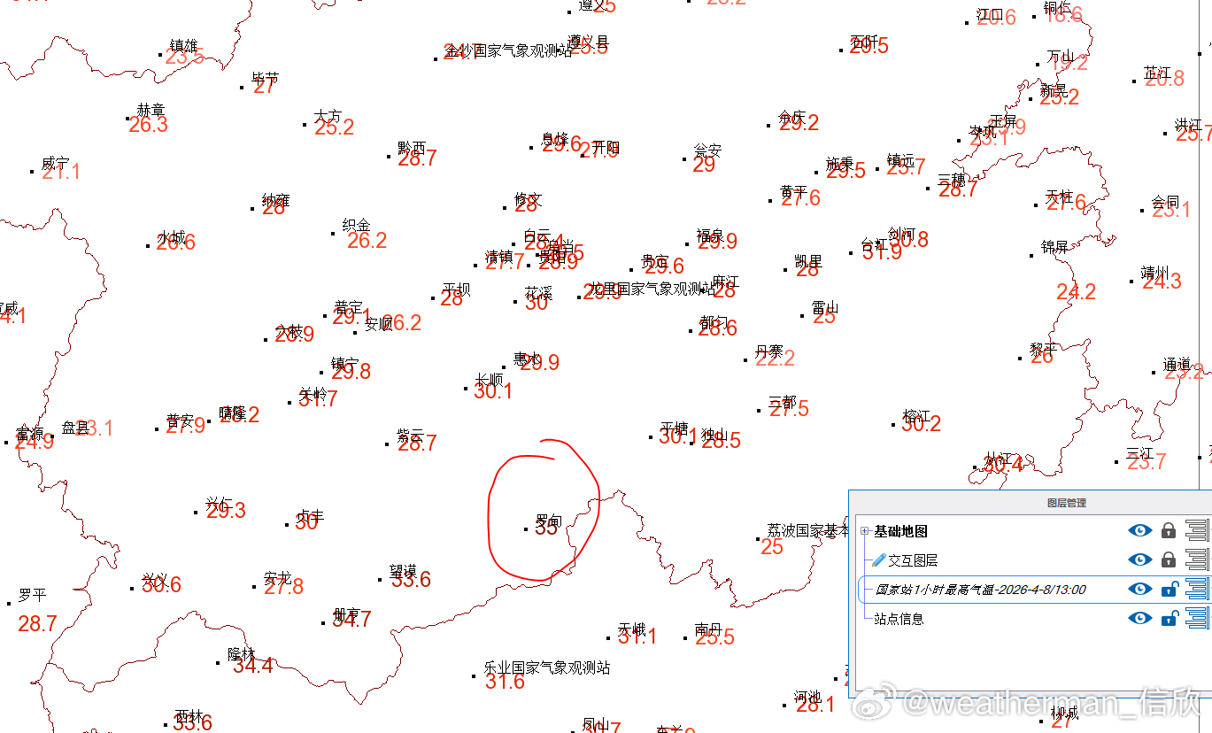 【高温和气温创新高】今天截至14时最高,海南澄迈39.7℃领跑高温榜。贵州罗甸今天截至13时最高35℃,拿下今年贵州省首个高温,截至14时最高36.9℃。贵州册亨在13-14时最高36.2℃、望谟35℃,也拿下当地今年首个高温。贵阳下午冲上30℃,为今年首次上30℃,上述贵州站点纷纷创今年气温新高。