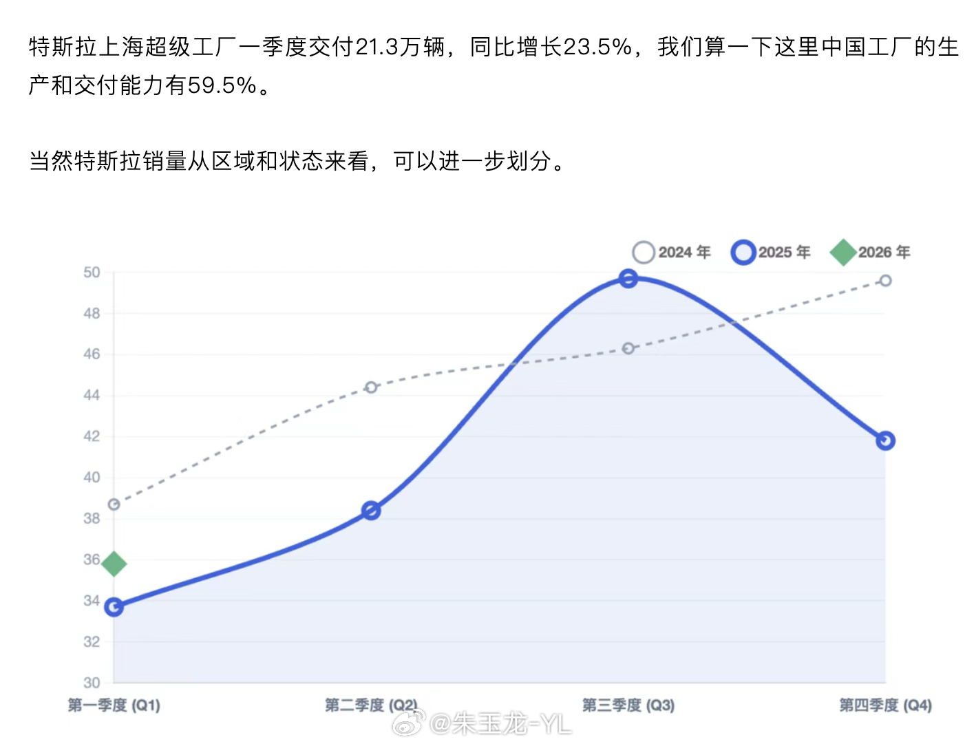 特斯拉 2026 年第一季度交付成绩,交付 35.8 万辆,同比仅增长 6.5%,环比下滑 14.4%。特斯拉上海超级工厂一季度交付21.3万辆,同比增长23.5%,我们算一下这里中国工厂的生产和交付能力有59.5%。当然特斯拉销量从区域和状态来看,可以进一步划分。