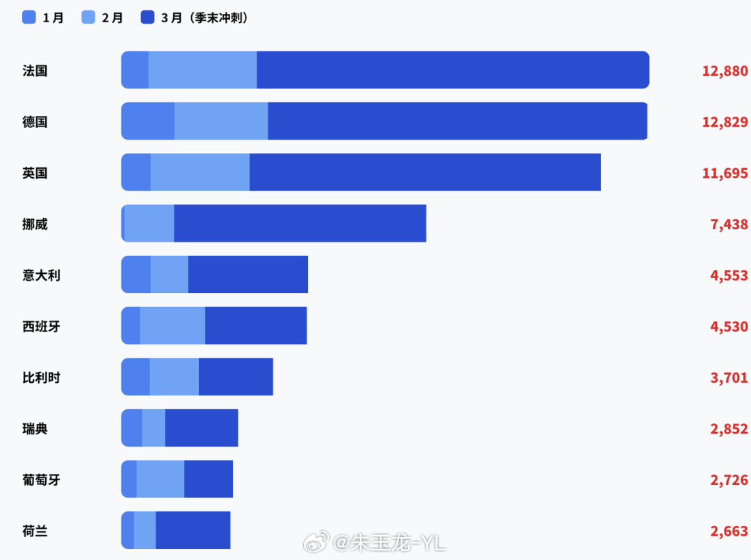 北欧市场弹性更大,挪威从2月的1205台跃升至6150台,单月放量接近5倍;瑞典从556台增长到1784台。从季度总量看◎ 法国Q1累计12880台、德国12829台、英国11695台,这三个市场合计占据绝对主力。◎ 第二梯队是挪威(7438台)、意大利(4553台)、西班牙(4530台)。◎ 而荷兰(2663台)、瑞典(2852台)、比利时(3701台)则属于中等规模市场。◎ 尾部市场如瑞士(984台)、奥地利(约1742台)体量依然有限。