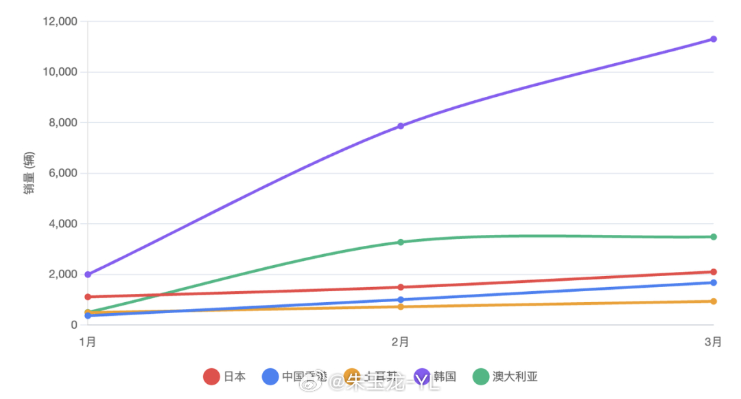 04其他区域◎ 韩国市场表现最为惊人,从1月的1996辆一路飙升至3月的11310辆;◎ 澳大利亚紧随其后,3月销量达到3485辆(同比提升23.2%);◎ 日本市场增长稳健,3月销量约2100辆,一季度累计销量达到约4700辆,已接近2025全年度销量的一半;◎ 中国香港与土耳其也分别在3月达到了1675辆和935辆。