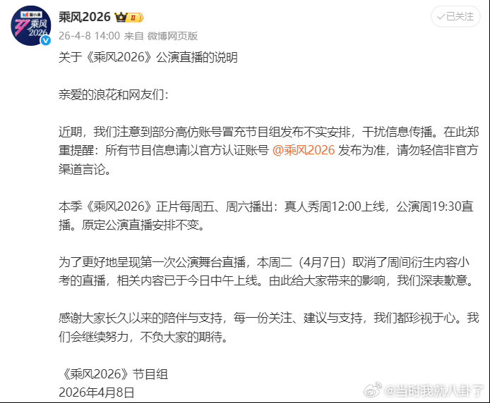 乘风2026高仿号被封号不信谣不传谣,认准官方账号 期待姐姐们精彩舞台浪姐6取消直播系谣言