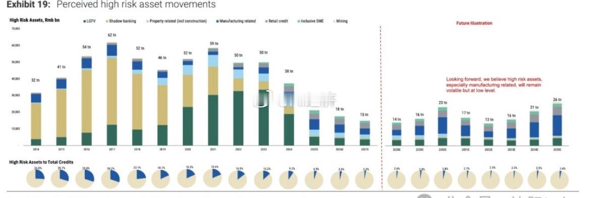摩根士丹利表示,中国的金融风险已从扩张转向消化与缓和阶段, 一方面剔除政府债券后的信贷增长已放缓至6%,工业、地产等部门的扩张更趋理性; 另一方面是中国银行系统正以每年3至4万亿人民币的规模,通过核销、出售及回收等手段持续处置不良贷款。 受此影响,曾在2017年达到62万亿人民币、占总金融资产30.2%的高风险资产,预计到2025年底将降至21万亿(占比4.9%),并有望在2027年底进一步收缩至15万亿(占比3%)。未来该类资产预计将稳定在总资产2%至4%的低位。宇文玥捞上来了