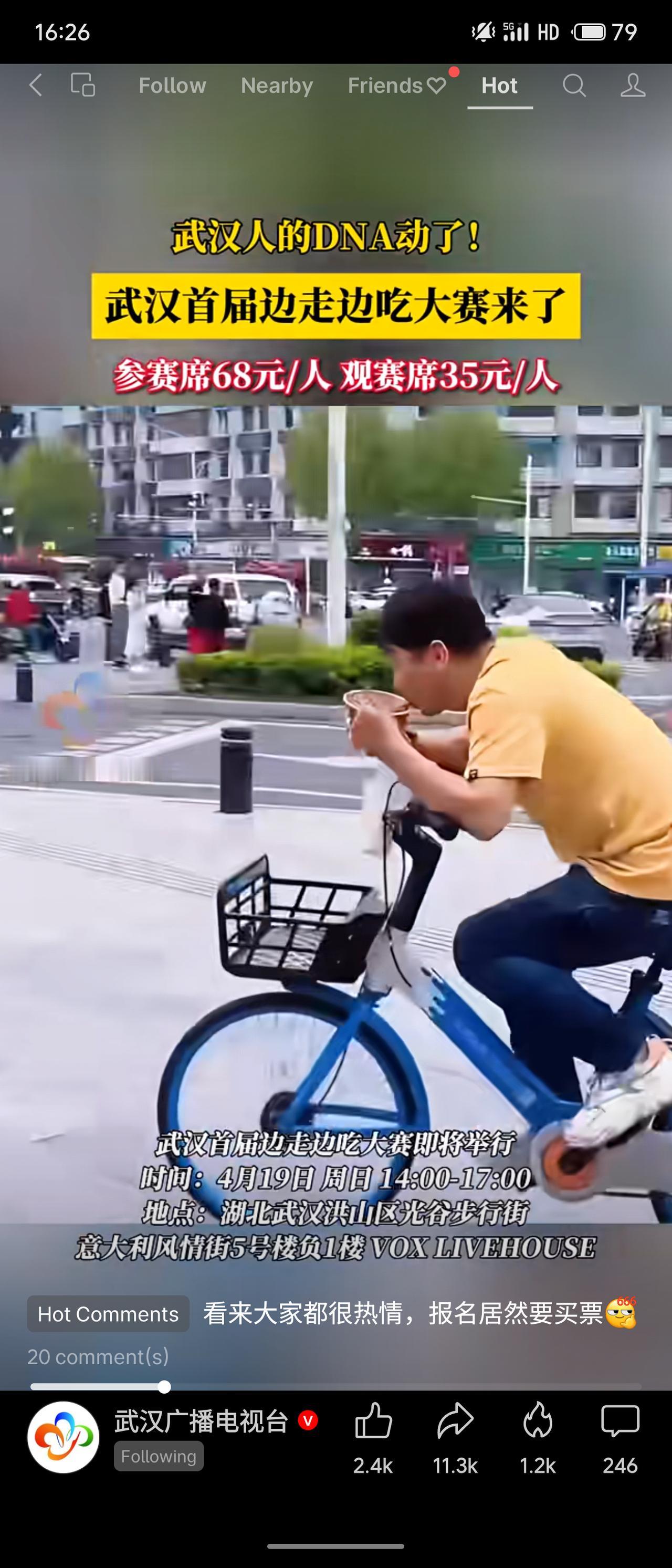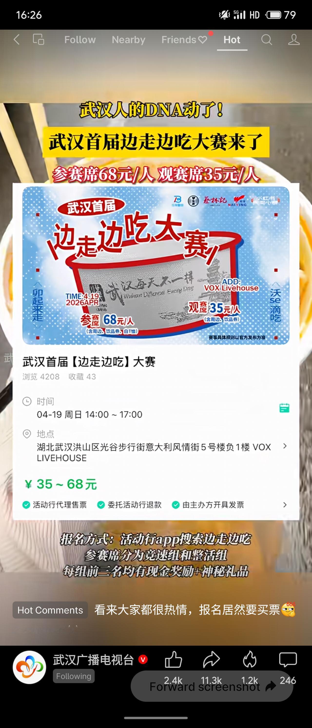 4月19日,武汉首届“边走边吃大赛”将在光谷步行街VOX Livehouse开赛,参赛席68元、观赛席35元,分竞速组和整活组,前三名有现金奖励。活动创意十足,将武汉人“过早”边走边吃的特色趣味化,不过报名需购票也引发网友调侃。