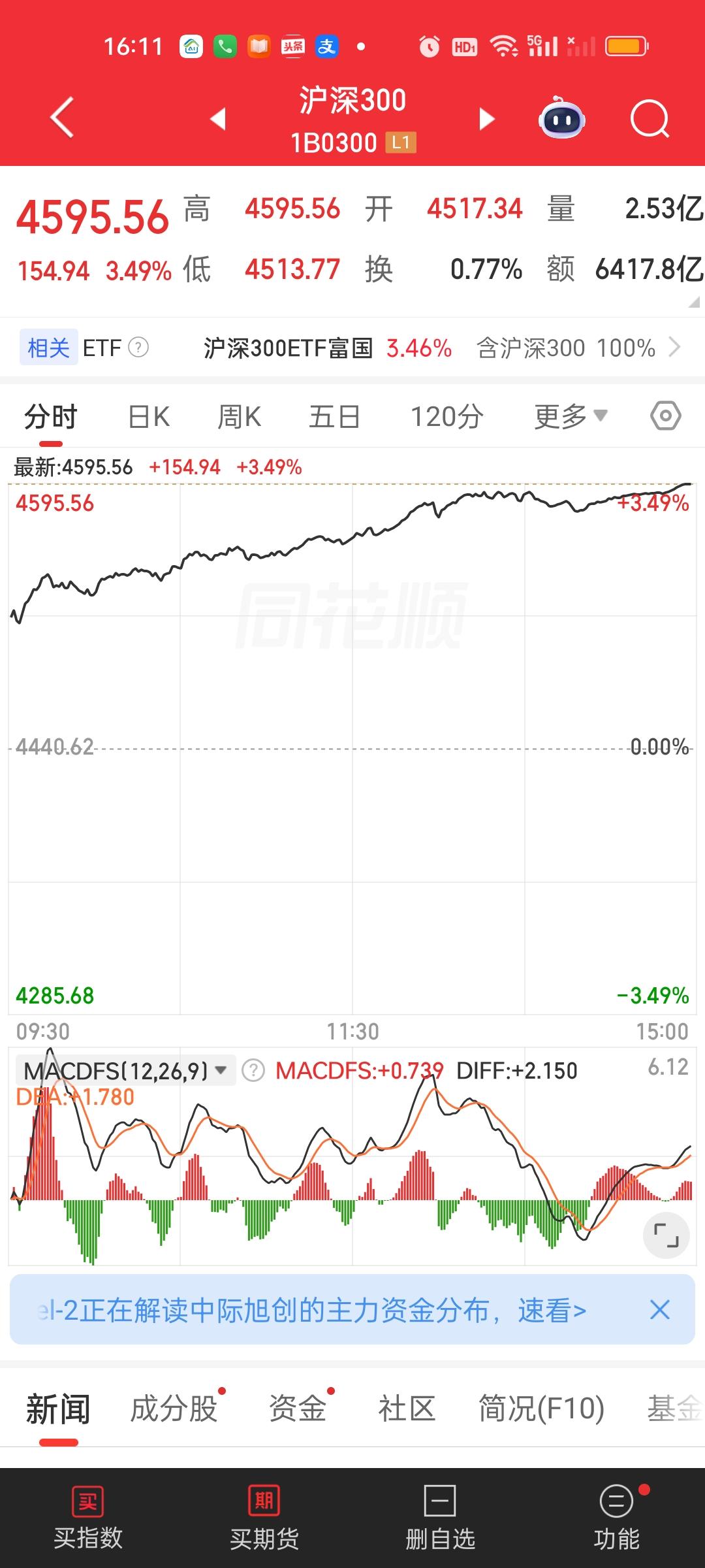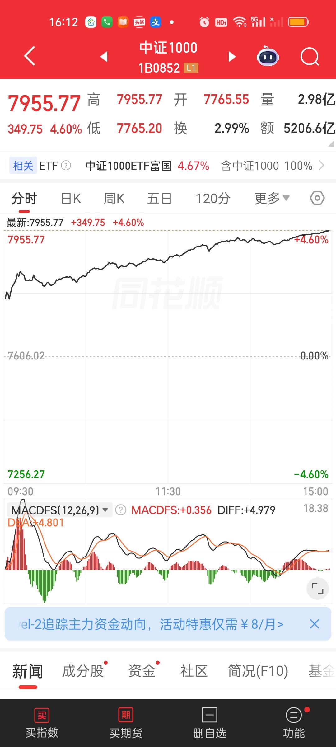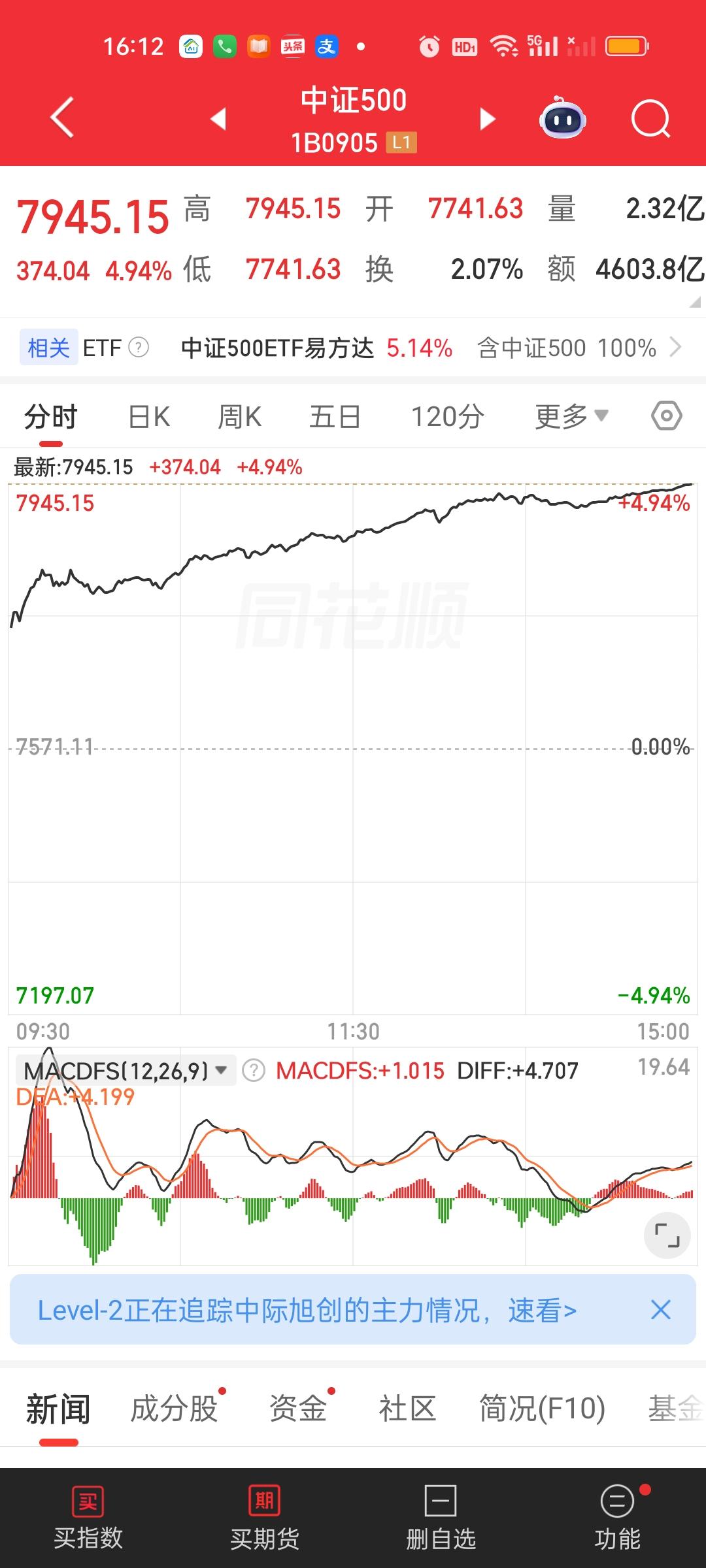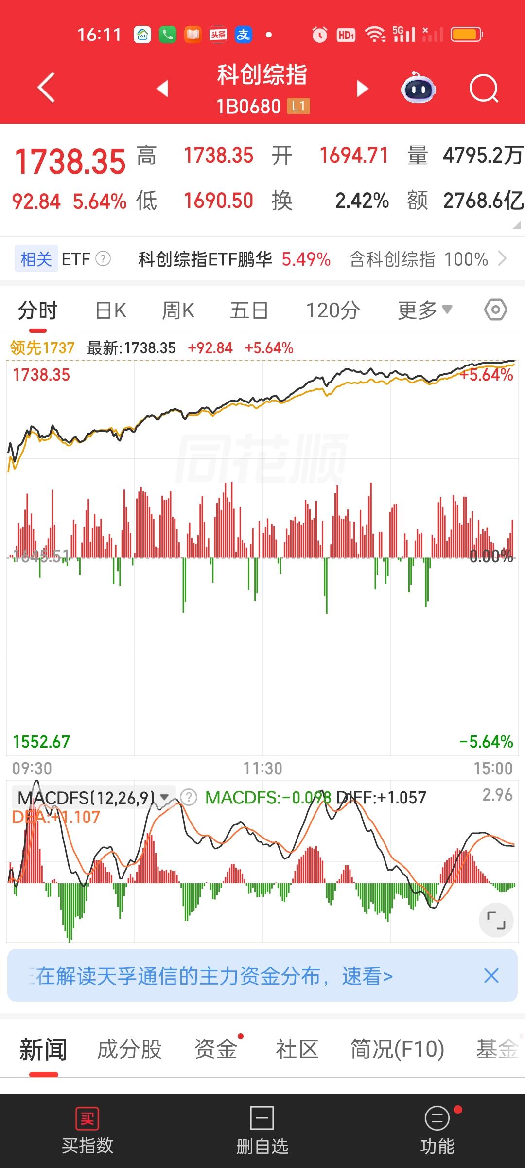 今天除了北证50,上证50和创业板指,其它所有指数全都收在了日内最高点,而且今天成交量放量了8271亿,大盘资金净流入超千亿。股民热情高涨,市场做多情绪强烈。再加上此刻美股三大股指期货全都是大涨的状态。那我们明天开盘大概率还会惯性高开。但应对策略不一样,场外基金明天收盘未必一定能大涨。场内基金明天惯性高开反而可以继续放大利润。但明天如果高开低走,下午回落的话,对场外基金是很不友好的!