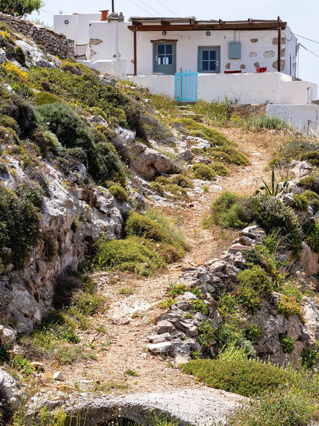 房子建在山坡上,纯白的基克拉迪风格,有两个露台和一个小花园。
